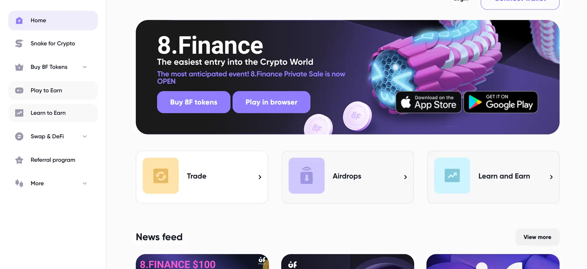 Users can earn real cryptocurrencies, by playing games, watching educational videos, completing quizzes, and participating in airdrops and tournaments on 8.Finance.