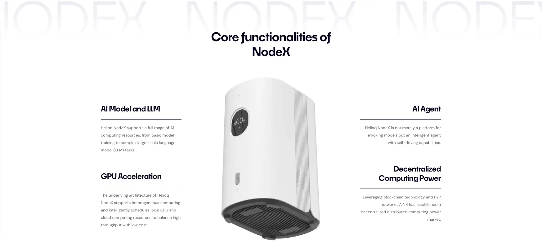 - Helioq NodeX devices are the core infrastructure of the AINX network. These plug-and-play hardware units provide decentralized compute power for AI tasks such as inference, training, and content delivery. Each device runs independently, contributing to a censorship-resistant, edge AI infrastructure. NodeX units enable scalable, GPU-accelerated performance, giving AINX its decentralized strength and privacy-preserving execution capabilities.