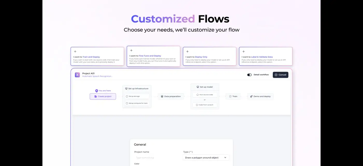 - Deploy or Fine-Tune AI Models: Train new AI models, fine-tune existing ones, or deploy directly using the platform’s infrastructure.