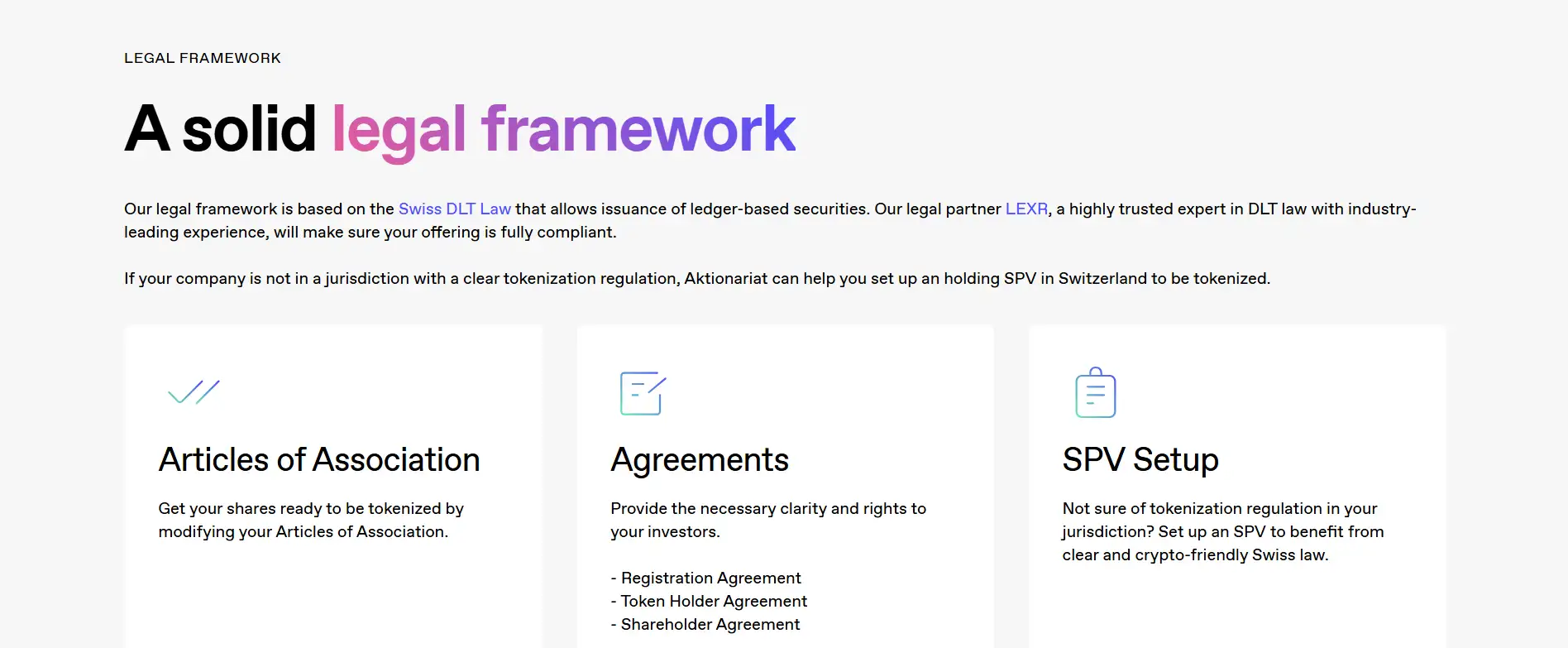 Built around the Swiss legal framework for ledger-based securities, the platform enables companies to issue shares as compliant digital tokens. When jurisdictional regulations are unclear, Aktionariat offers support for setting up a Swiss SPV (Special Purpose Vehicle) to facilitate tokenization under clear Swiss law. Their services include legal document templates, onboarding support, and white-label tools tailored to each issuer.