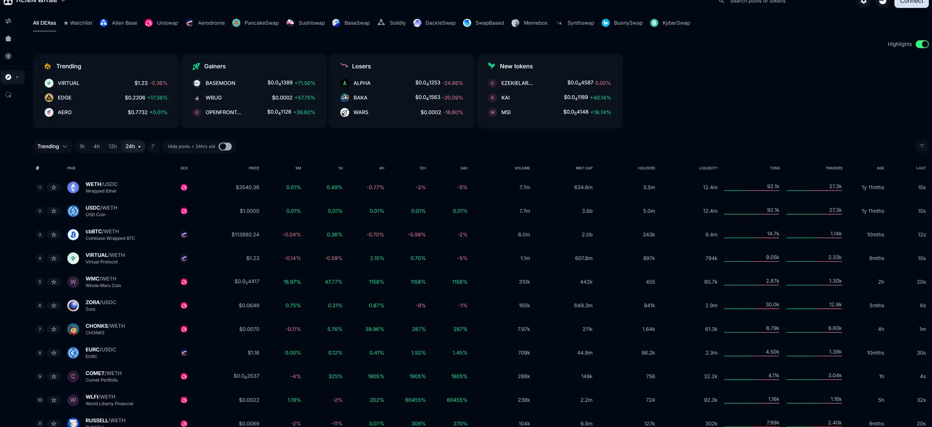 Compared to competitors such as Uniswap, Camelot, and PancakeSwap, Alien Base stands out by offering a significantly more advanced trading stack and prioritizing UI/UX without compromising decentralization. Additionally, the platform is completely independent of Coinbase, despite building on Base. This independence gives it full creative freedom to shape its vision and implement new features without constraint.