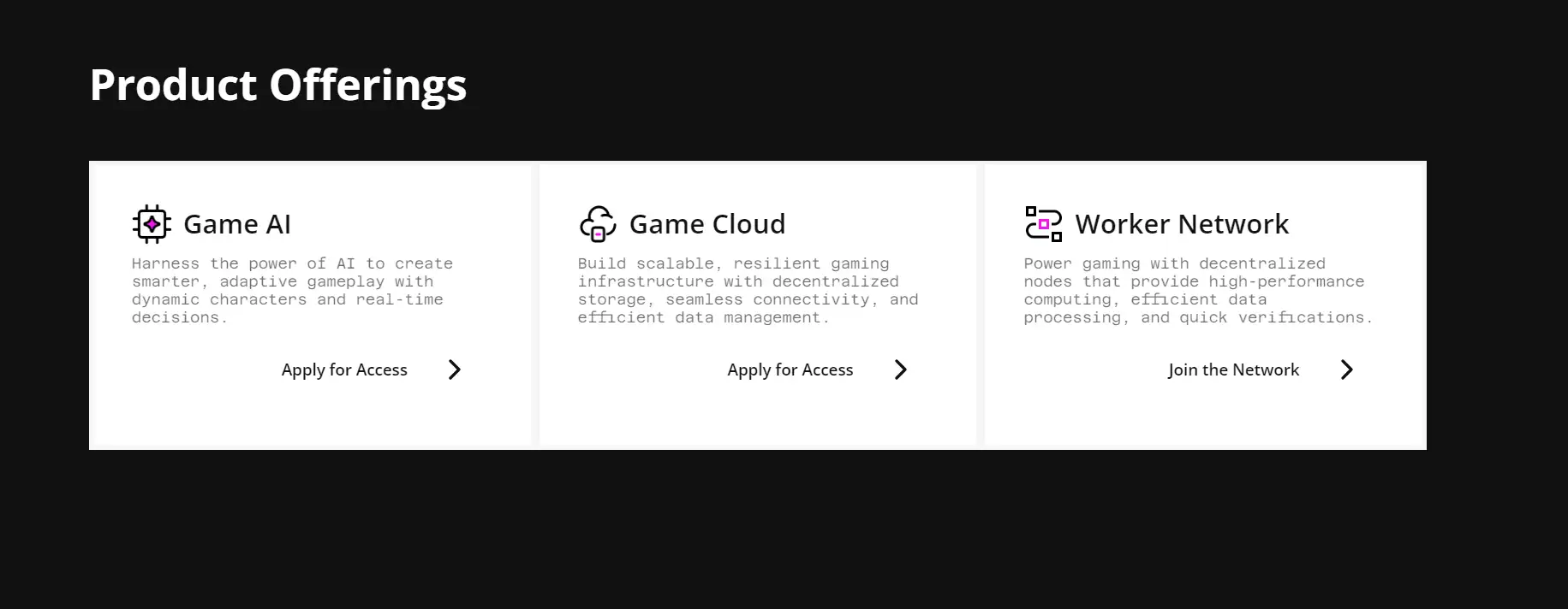 - Decentralized Game Cloud: The Game Cloud offers a suite of tools such as AssetVault for decentralized storage, GameFront for content delivery, and NetFlow for bandwidth sharing. These solutions ensure a scalable and secure gaming experience for developers and players.