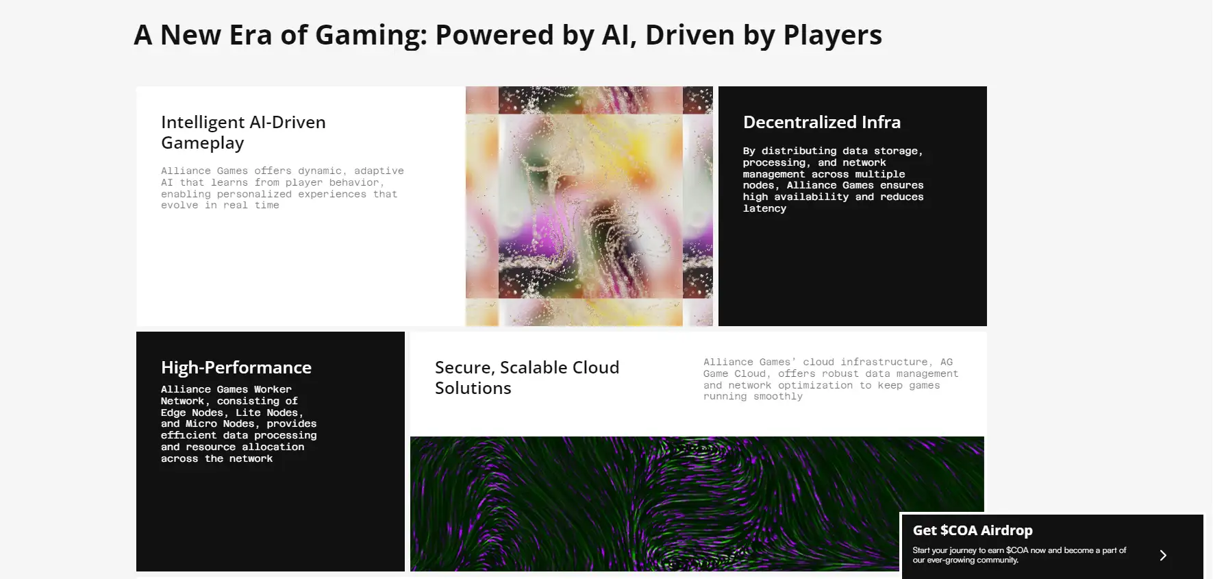 Alliance Games is a groundbreaking platform that combines the power of blockchain technology and artificial intelligence (AI) to revolutionize the gaming industry. The platform is designed to empower developers and gamers alike by providing a decentralized infrastructure for hosting, creating, and enhancing games. At the core of Alliance Games’ mission is the idea of fostering true ownership, where players have control over their assets and contributions while enjoying immersive and intelligent gaming experiences. By integrating AI, the platform ensures that games evolve dynamically, offering adaptive and ever-changing gameplay that responds to player interactions.