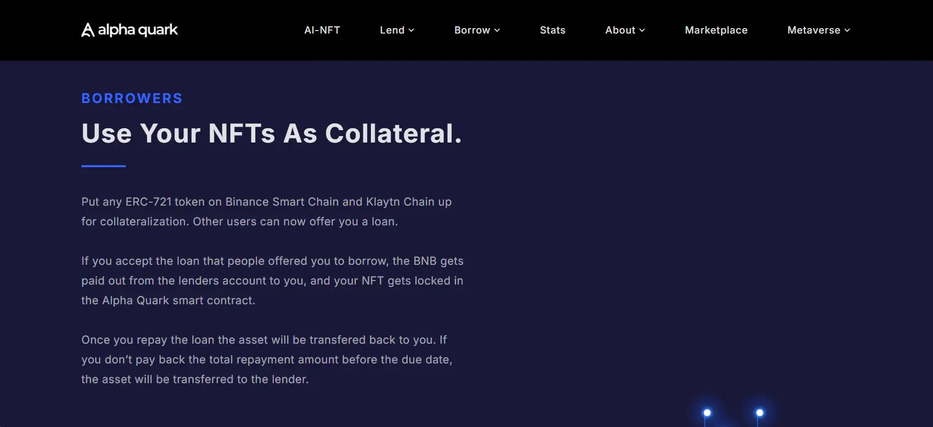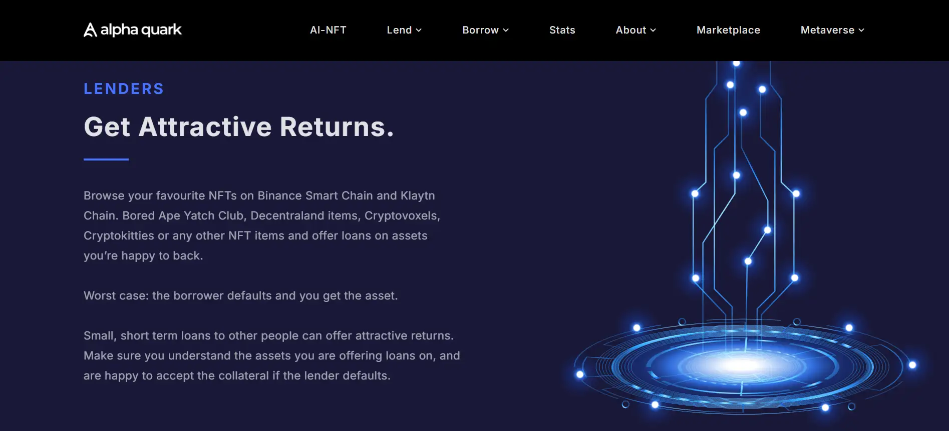 Alpha Quark is one of the few lending protocols operating on Binance Chain and Klaytn, making it ideal for users outside of Ethereum’s ecosystem. Unlike competitors like NFTfi, Arcade, or BendDAO, Alpha Quark also integrates metaverse and marketplace functionality, creating a more holistic NFT experience.