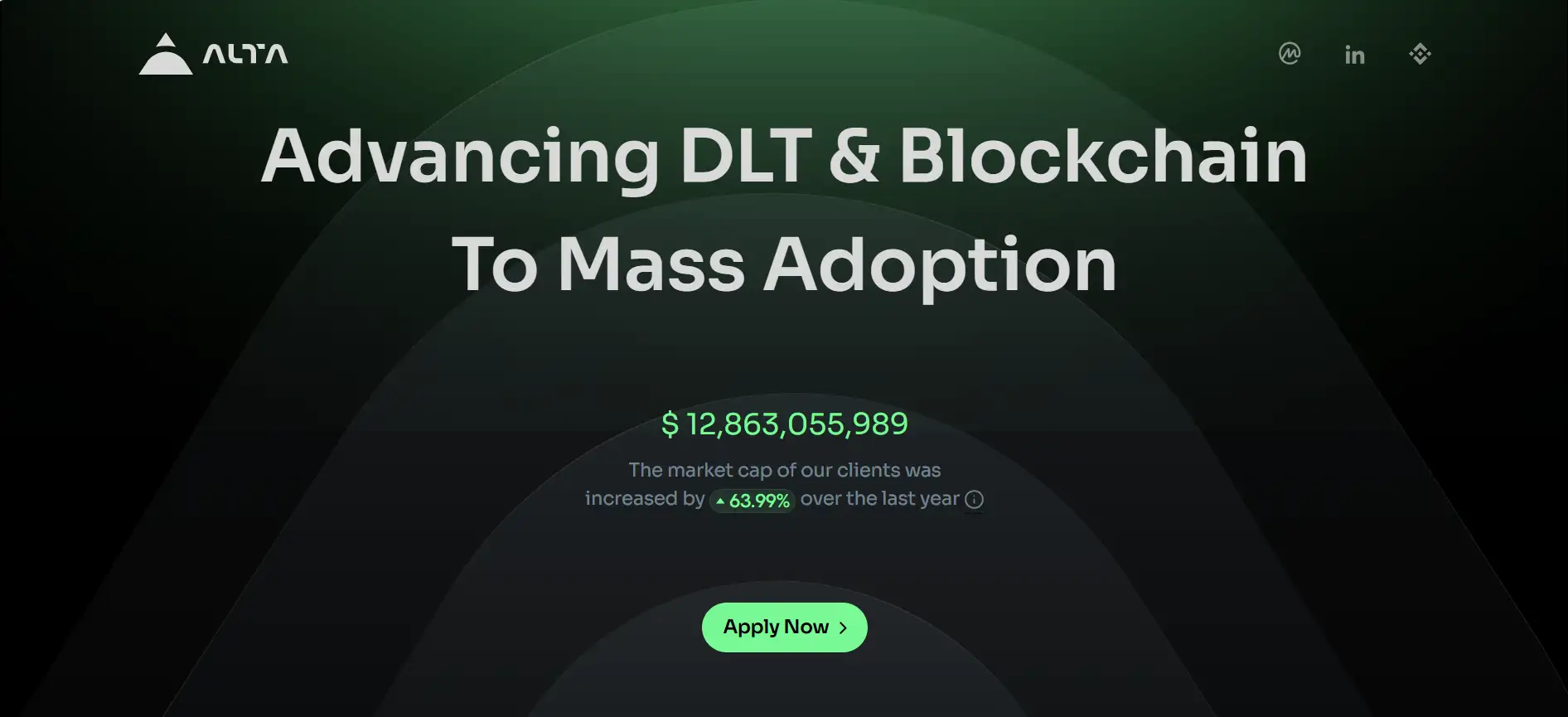 ALTA is an advanced blockchain and DLT consulting platform dedicated to driving mass adoption of decentralized technologies by helping businesses strategically enter and scale within the tokenized economy. With a core philosophy of merging technology optimization with business adaptability, ALTA has empowered its clients to grow significantly—achieving a collective market cap increase of over $12.8 billion, with a 63.99% year-over-year growth.