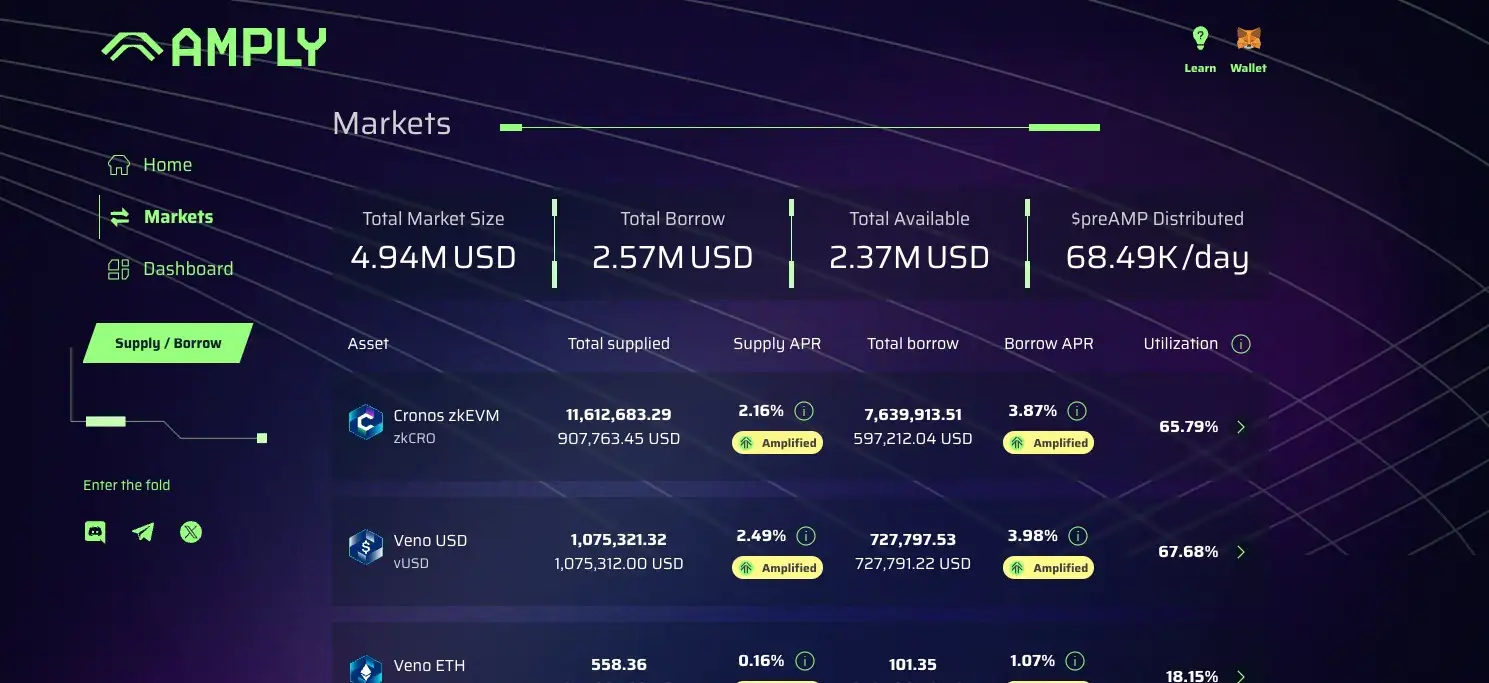 Amply Finance is a decentralized finance (DeFi) protocol designed to provide peer-to-pool lending on the Cronos zkEVM chain. At its core, Amply Finance offers users the opportunity to supply assets to lending pools and earn interest, while others can use these assets as collateral to borrow additional cryptocurrencies. The protocol is built to solve liquidity issues in the DeFi ecosystem, allowing seamless transactions and providing users with a transparent and trustless financial system.