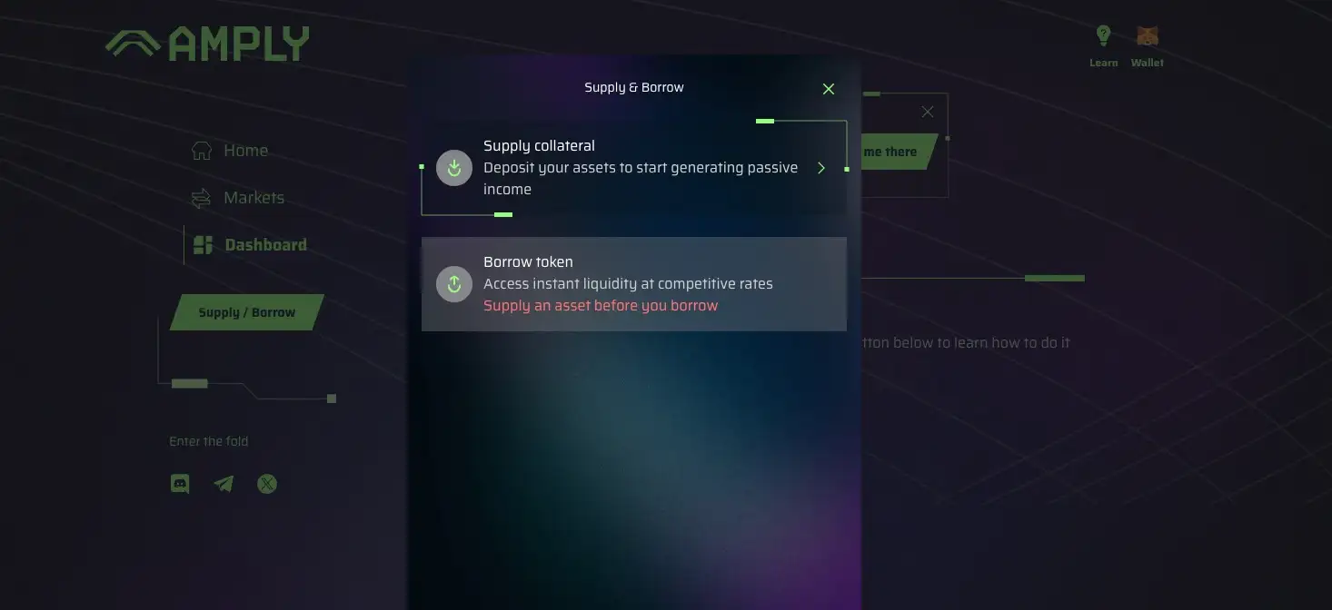 - Connect Your Wallet to Amply: Once your wallet is set up and configured, visit the Amply Finance website and click on “Connect Wallet.” This will prompt you to connect your chosen wallet (MetaMask or others) to the platform.