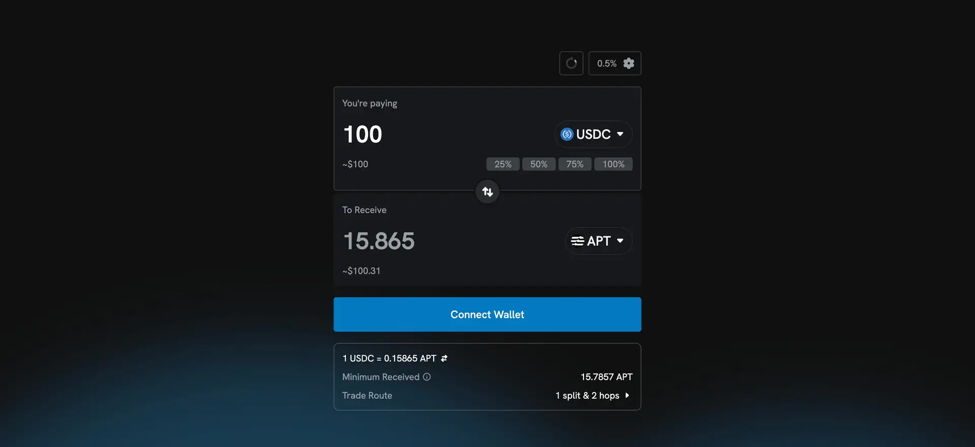 - Comprehensive DEX Aggregation: Anqa aggregates liquidity from multiple decentralized exchanges on the Aptos blockchain, ensuring users always access the best trading rates and minimal slippage. This feature eliminates the need to manually search for the best prices across different platforms, making trading more efficient and cost-effective.