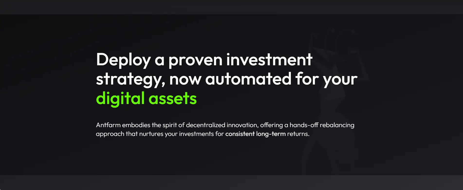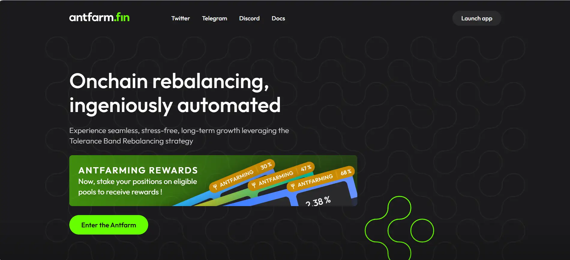 Antfarm Finance is an innovative DeFi protocol that automates onchain portfolio rebalancing through a novel strategy called Tolerance Band Rebalancing. Unlike traditional decentralized exchanges, Antfarm is purpose-built for Liquidity Providers (LPs), offering long-term value generation through intelligent, automated market positioning. Deployed across Ethereum, Avalanche, Arbitrum, and Polygon zkEVM, Antfarm combines high-fee pools and rebalancing thresholds to maximize profitability in volatile markets.