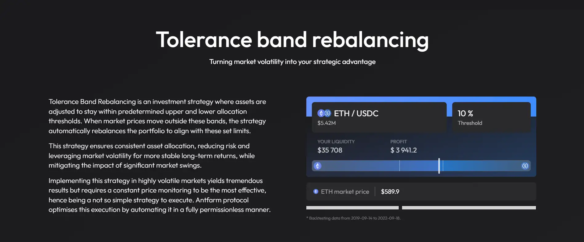 - Automated Rebalancing: The Tolerance Band Rebalancing strategy allows liquidity pools to automatically realign allocations when markets shift, minimizing risk while maximizing yield.