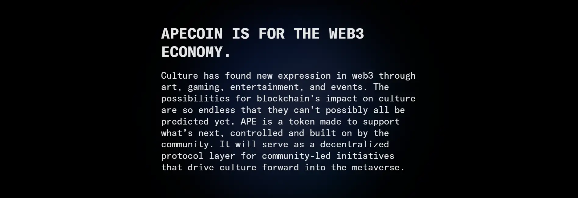ApeCoin is a decentralized protocol layer designed to support community-led initiatives shaping the future of the open internet. Built for the Web3 economy, ApeCoin plays a central role in enabling on-chain governance, incentivizing creators, and unlocking access to exclusive digital and real-world experiences. From gaming and metaverse platforms to DAO governance and tokenized events, ApeCoin empowers its holders to help define what’s next in decentralized culture.