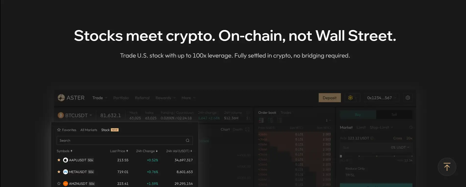 Aster offers on-chain access to U.S. stock perpetual contracts using its 1001x mode. This feature allows users to open leveraged positions—up to 100x—that are fully collateralized and settled in crypto, eliminating the need for bridging traditional assets. Users can interact directly from their wallet, enjoying high-speed execution and full control, all within the Aster app.