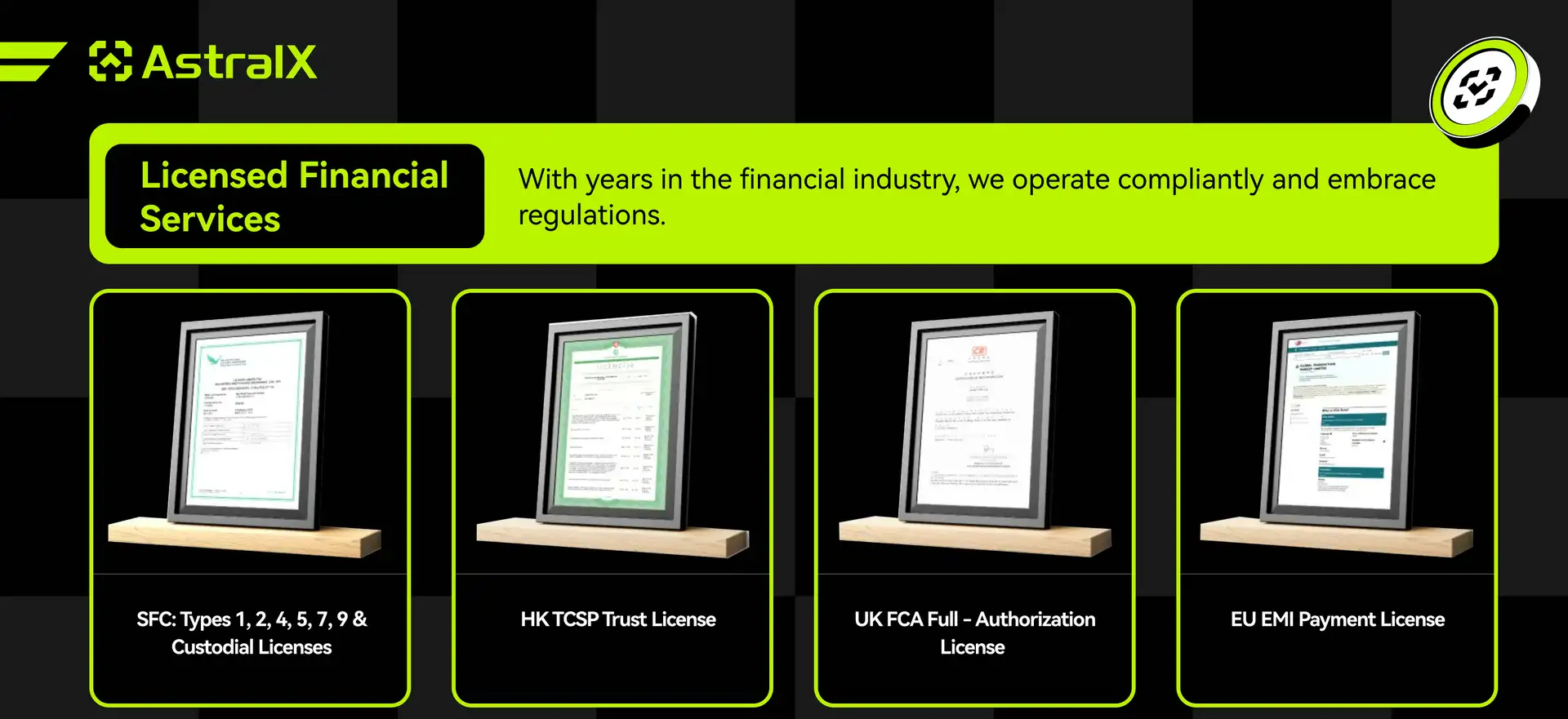 - AstralX is fully licensed under UK FCA, EU-standard Polish regulation, and Hong Kong SFC, allowing it to serve a global audience with confidence. These licenses mean that users across Europe, Asia, and beyond can trade in a legally compliant environment. This regulatory transparency reduces risks associated with unregulated exchanges and builds trust in AstralX's operations. For international traders, this also ensures access to localized services, stable liquidity, and protective oversight against fraud or fund mismanagement.