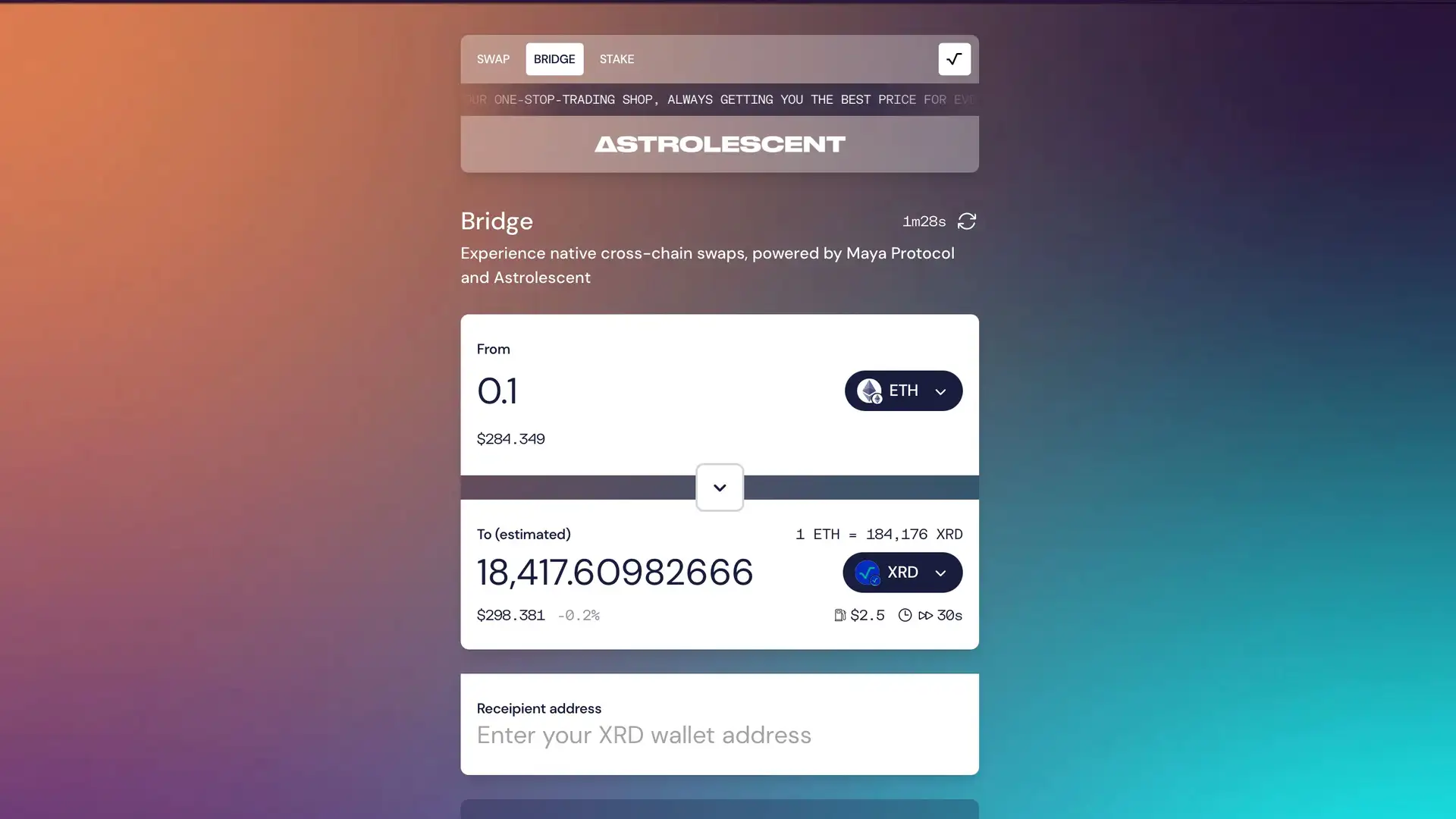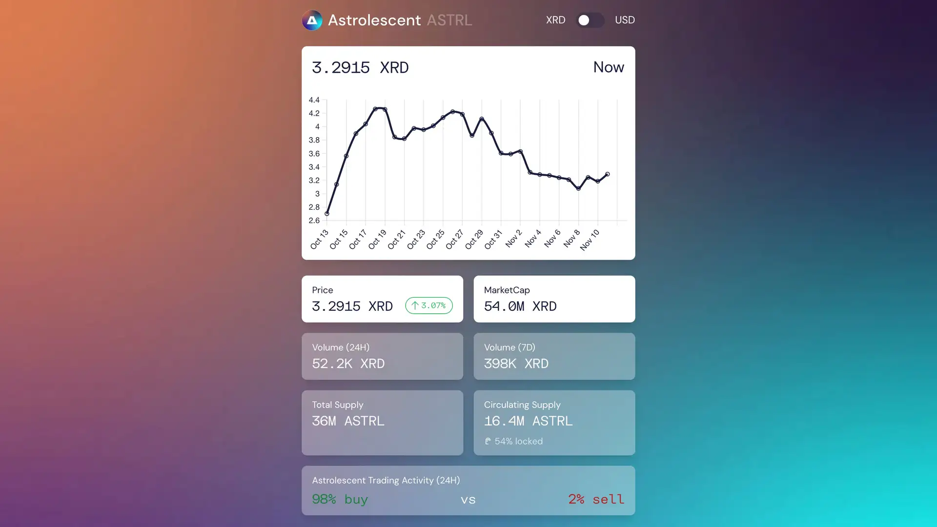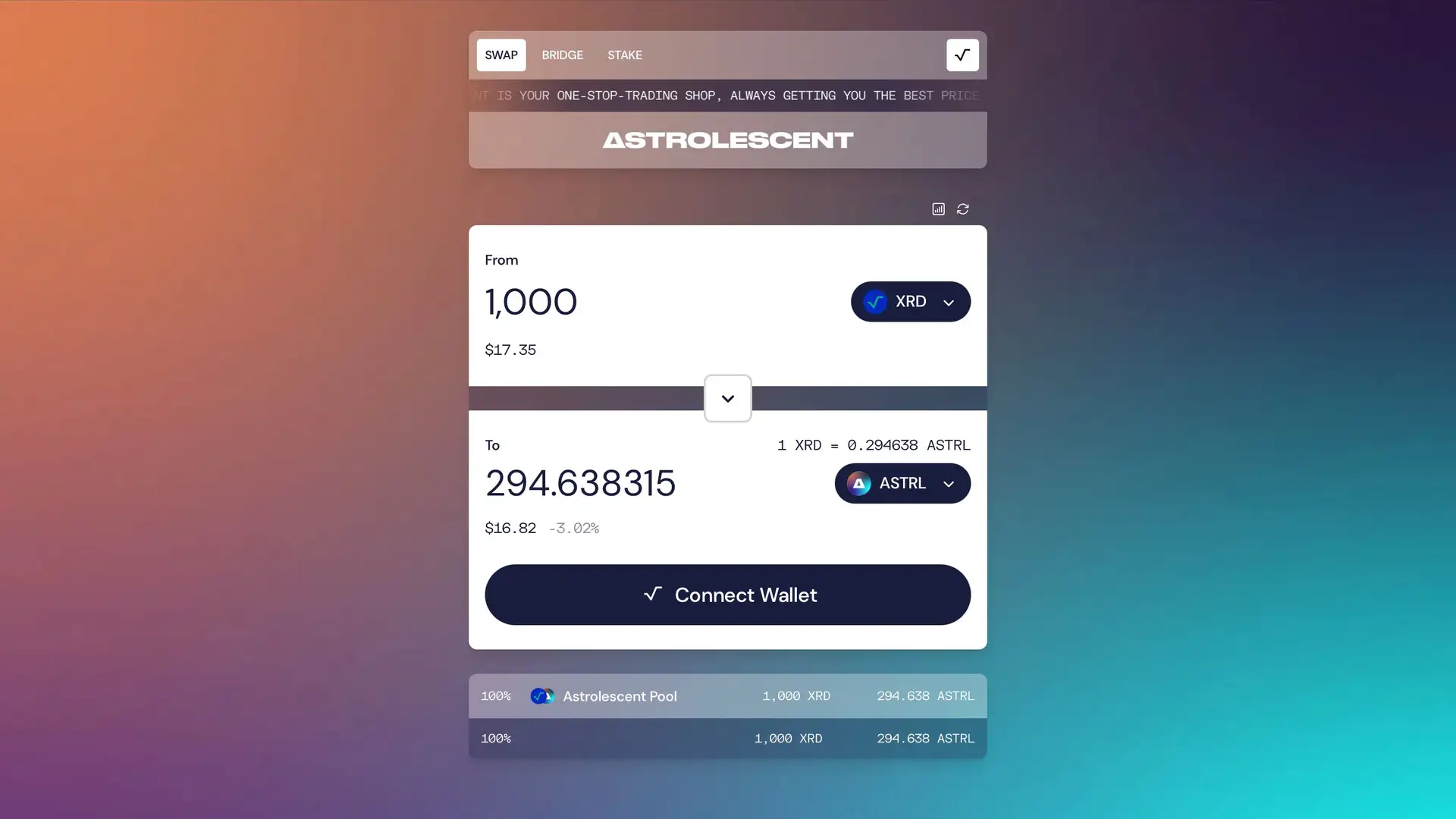 Astrolescent is an advanced decentralized exchange (DEX) aggregator designed to optimize trading on the Radix blockchain. The platform aggregates liquidity across multiple DEXes, ensuring users receive the best prices for token swaps and minimizing costs through price slippage reduction.