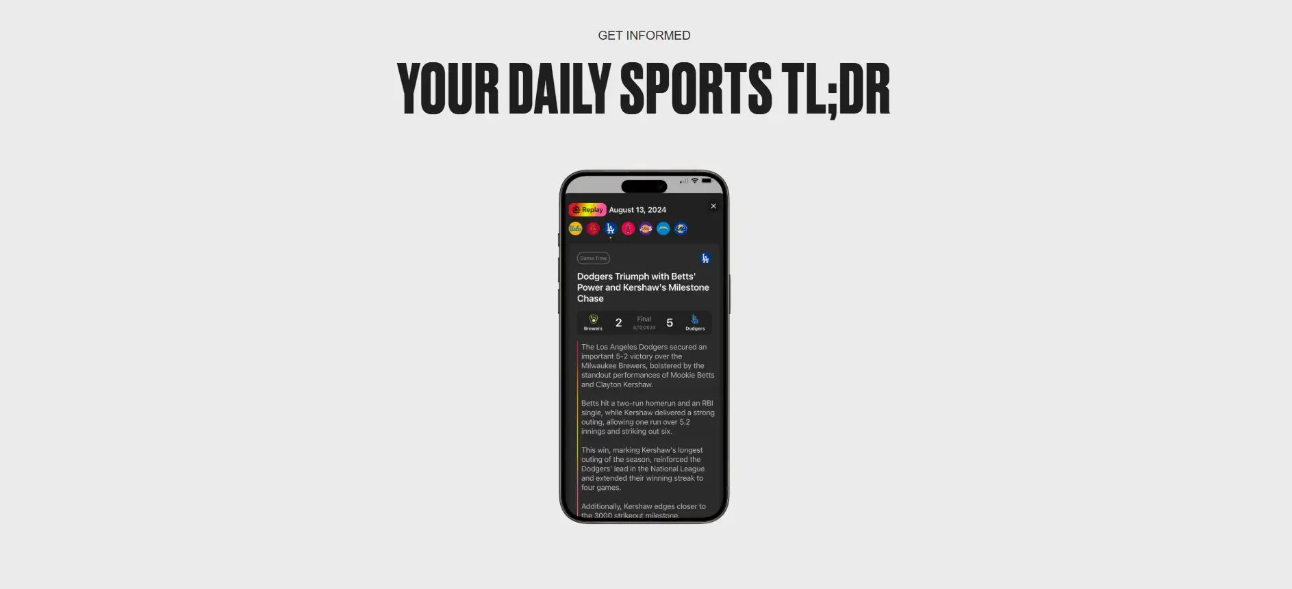 - Personalized Sports Feed: Stay up to date with a curated “TL;DR” feed of daily sports news and insights, tailored to your favorite teams and leagues.