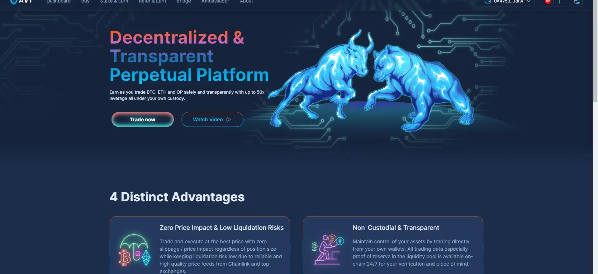 AVT is a decentralised, transparent and non custodial perpetual platform built on Optimism where users can swap, long or short BTC, ETH and OP with up to 50x leverage.