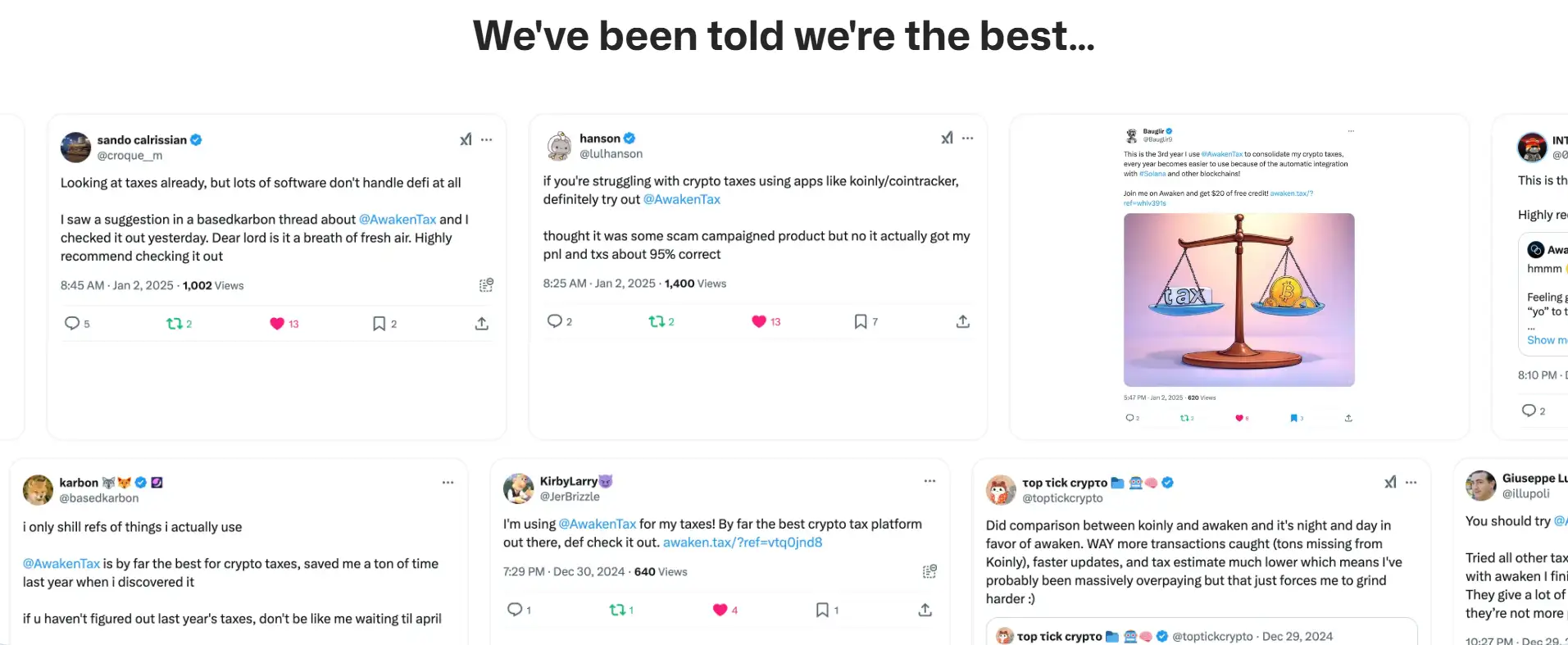 Competitors such as Koinly, CoinTracker, and CryptoTaxCalculator offer similar services, but Awaken stands out by focusing on the crypto-native user experience, offering better automation, faster support, and more accurate analytics for advanced use cases like DeFi, NFTs, and on-chain derivatives.