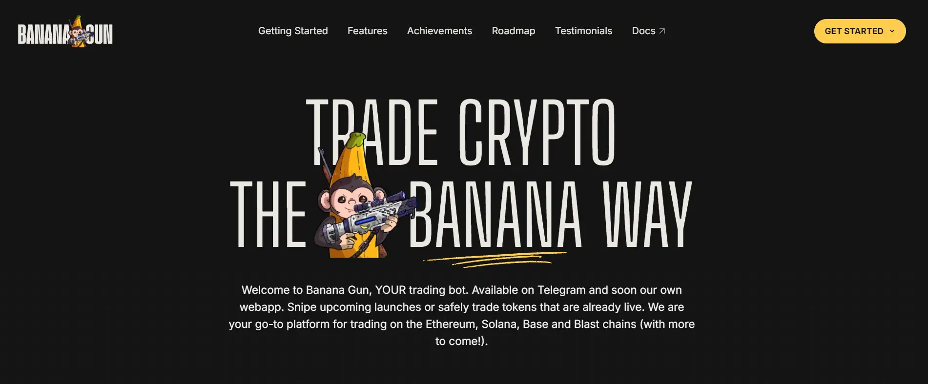 Banana Gun is an innovative, Telegram-based multi-chain trading bot that simplifies and secures cryptocurrency trading. It allows users to trade tokens across major blockchains like Ethereum, Solana, Base, and Blast, providing a seamless experience for both novice and seasoned traders. By focusing on features like automated sniping, copy trading, and anti-rug protections, Banana Gun has positioned itself as a trusted tool for navigating the highly dynamic crypto market.