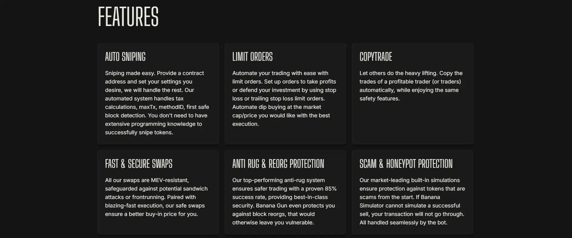 Since its inception, Banana Gun has expanded to support multiple blockchains, including Solana, Base, and Blast, catering to a broader audience. Key functionalities such as automated sniping, limit orders, and copy trading allow users to execute advanced trading strategies with ease. Security remains at the core of the platform, with features like scam and honeypot detection and MEV-resistant mechanisms safeguarding user assets.