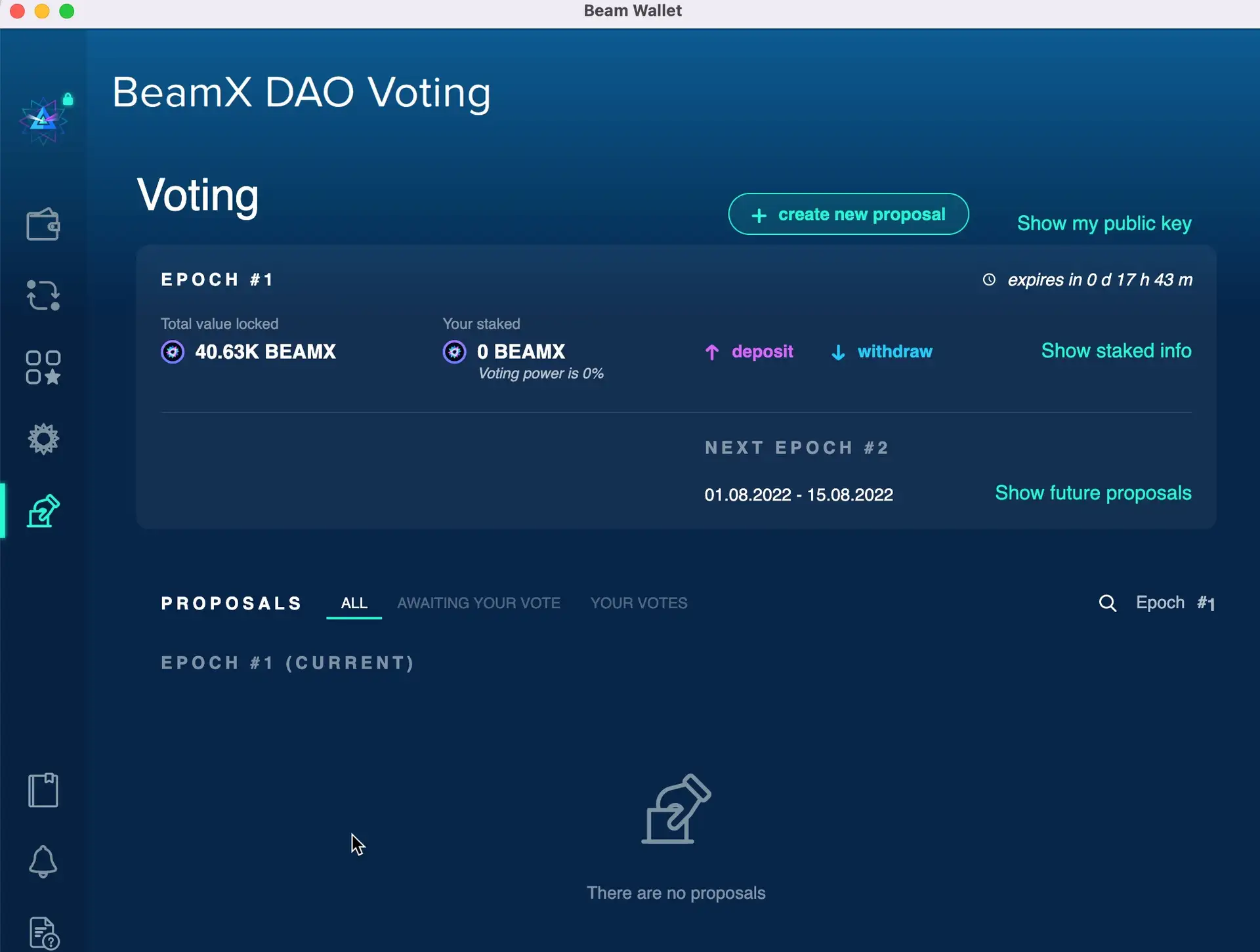 - Join the BeamX DAO: With your BEAMX tokens, you can join the BeamX DAO by accessing the voting platform through your Beam Wallet. Here, you'll find active proposals that you can vote on, as well as the option to submit your own proposals for consideration by the community.