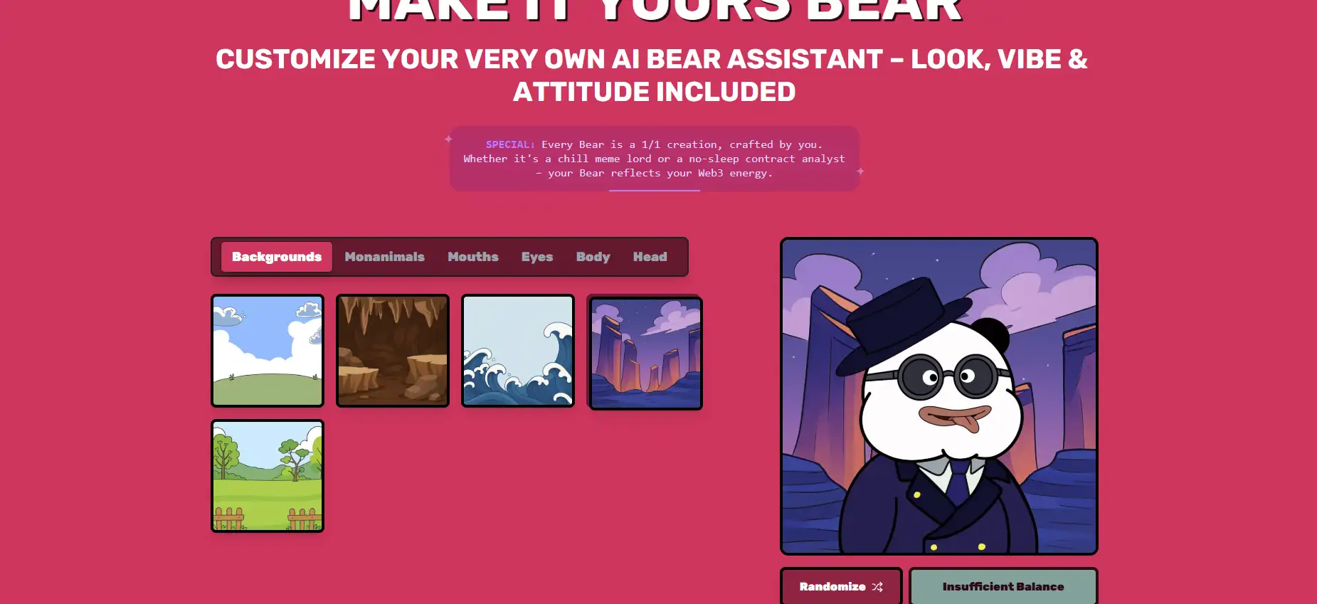 - Pick Your Bear: Choose your AI companion — each bear has a unique personality and aesthetic. You can later customize it with NFT-based accessories.