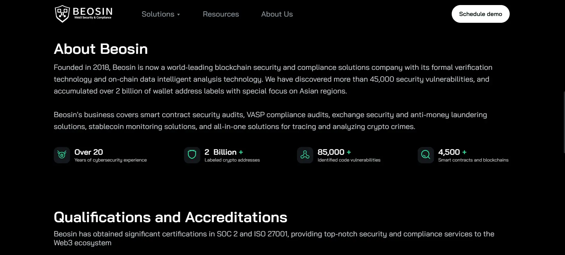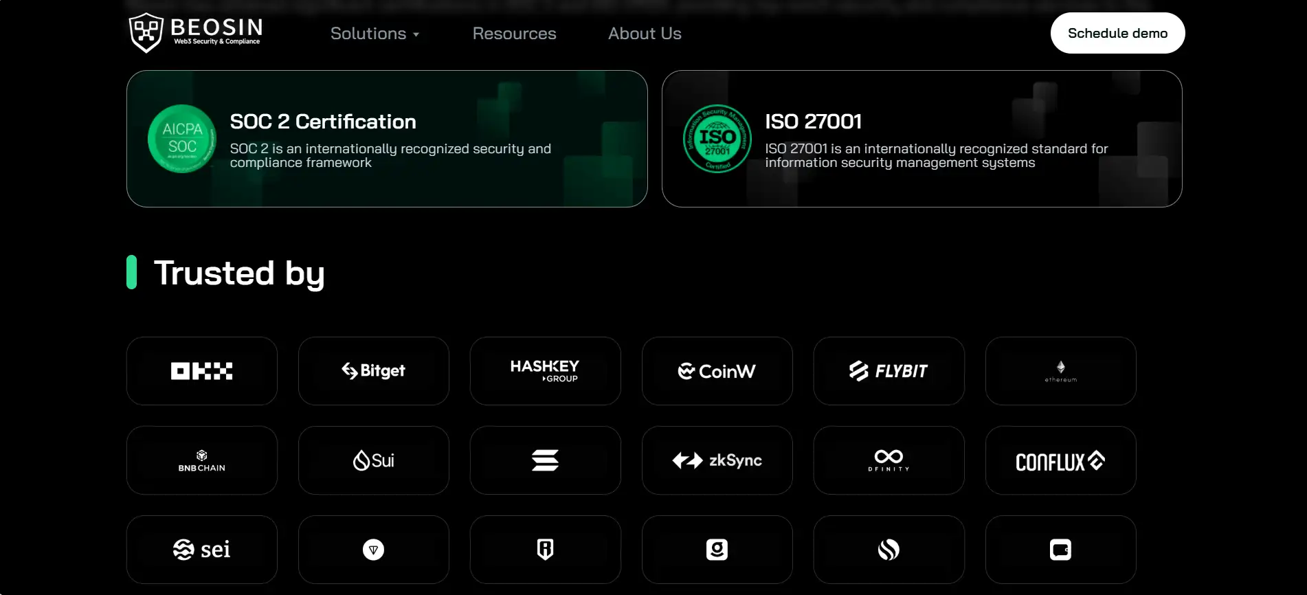 - Regulatory Alignment: With SOC 2 and ISO 27001 certifications, Beosin adheres to the highest standards of data protection, making it a trusted partner for regulated institutions and enterprises.