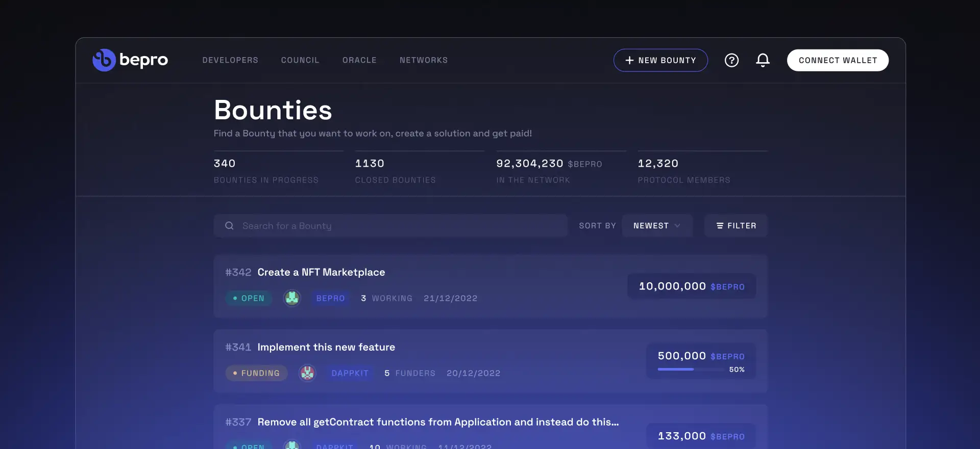 - Decentralized Marketplace: BEPRO provides a platform where developers and project owners can interact without the need for intermediaries. This decentralized approach ensures transparency, security, and efficiency in all transactions and interactions.