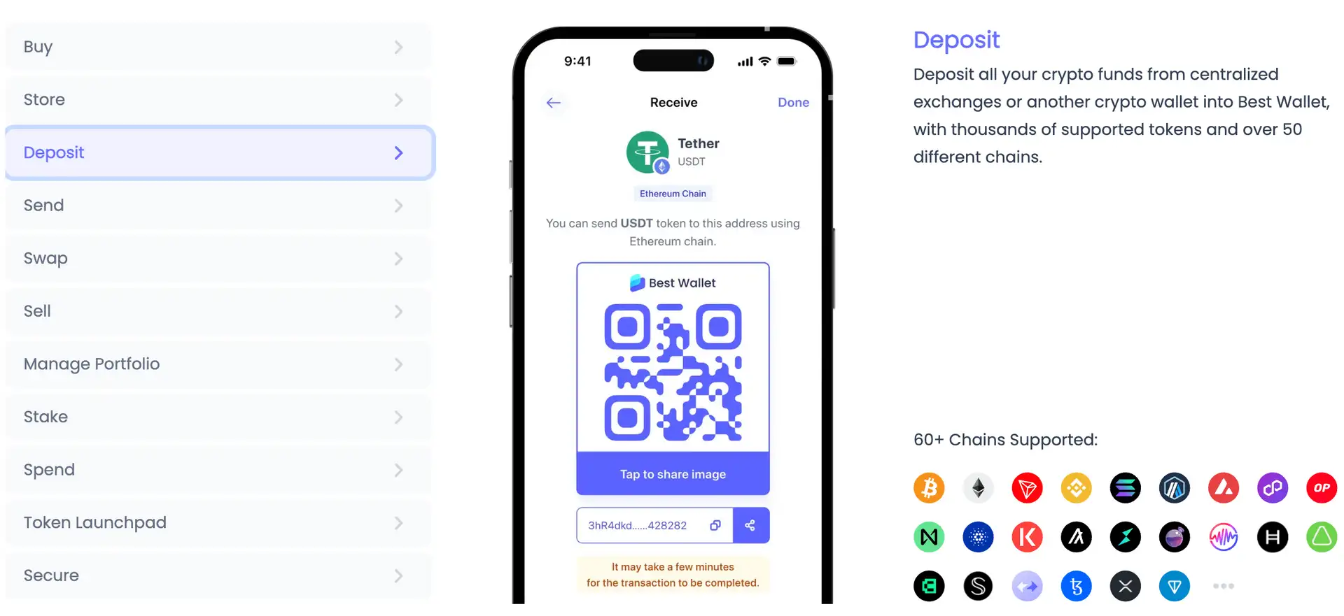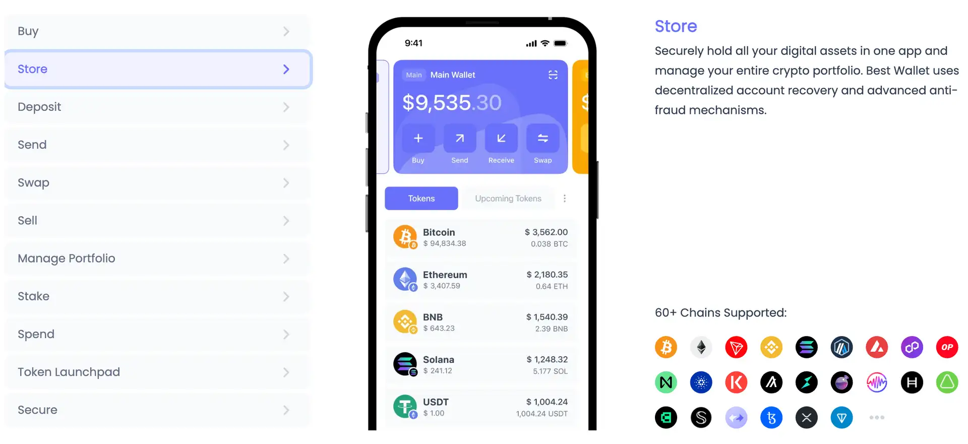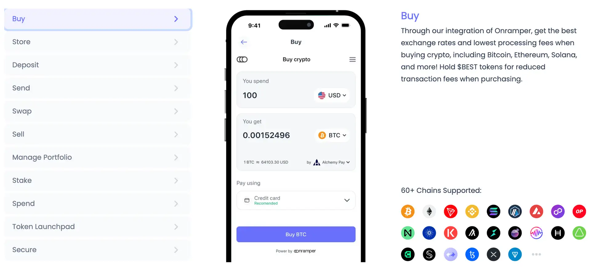 The wallet supports 60+ blockchains including Ethereum, Solana, Polygon, Bitcoin, and BNB Chain. Users can easily buy, send, swap, and stake assets all from within the app. With its fiat onramp powered by Onramper and integrated token presale access, Best Wallet simplifies Web3 participation for both new and seasoned users.