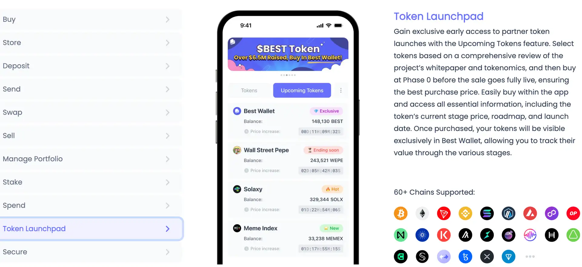- Presale Access: Exclusive entry to new project presales and airdrops through the Upcoming Tokens portal, available only to Best Wallet users.