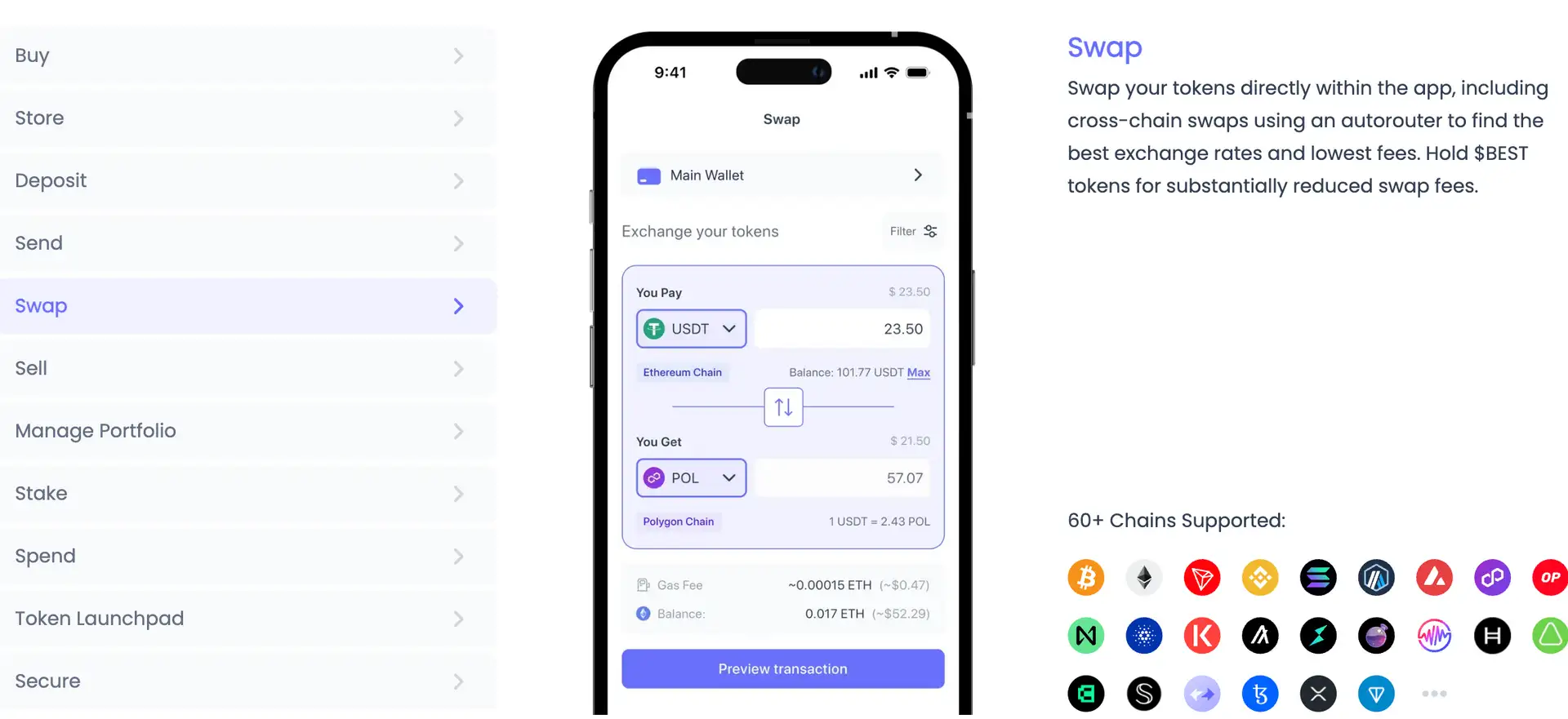 Best Wallet is an innovative, multi-functional, non-custodial crypto wallet built for the next generation of Web3 users. As a mobile-first solution, it prioritizes security, speed, and intuitive design, allowing users to manage, trade, and stake digital assets across more than 60 blockchains. With built-in tools for cross-chain swaps, presale access, and governance, it’s a powerful alternative to traditional wallets that offer only basic functionality.