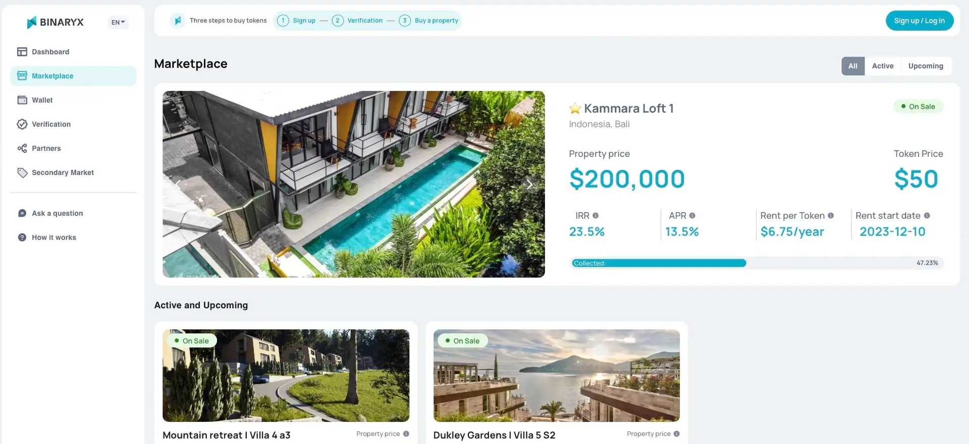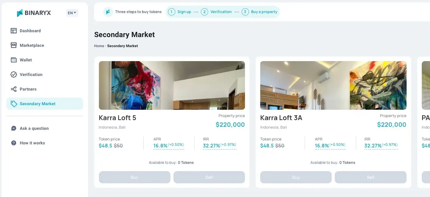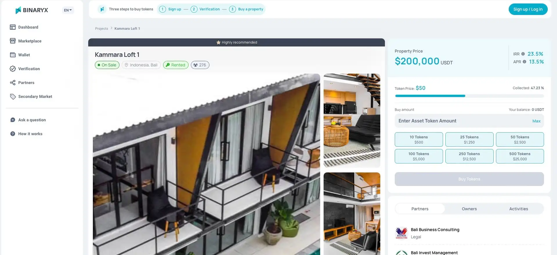 - Explore Properties: Browse the available tokenized real estate properties on the Binaryx marketplace. Each listing provides detailed information about the property, including its location, value, and investment potential.