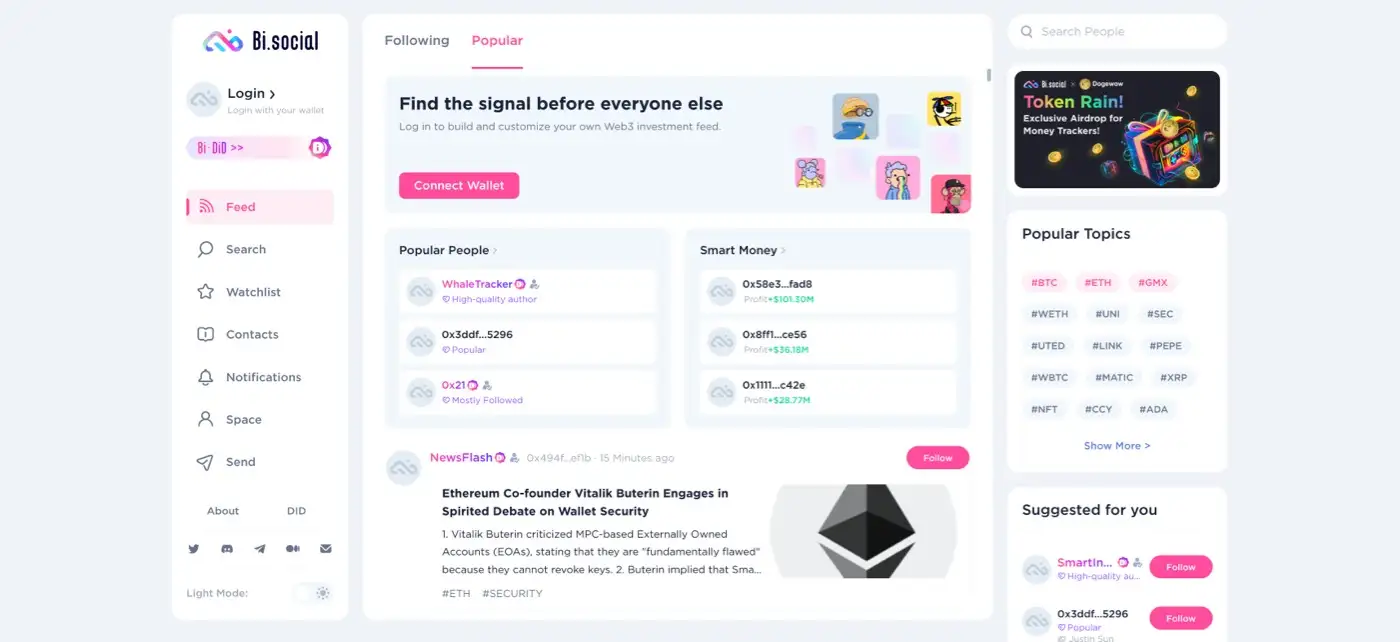 Bi.social is a pioneering Web3-native social networking platform that integrates decentralized finance (DeFi) with social media, allowing users to engage in social trading, share investment strategies, and interact with a community of like-minded individuals.