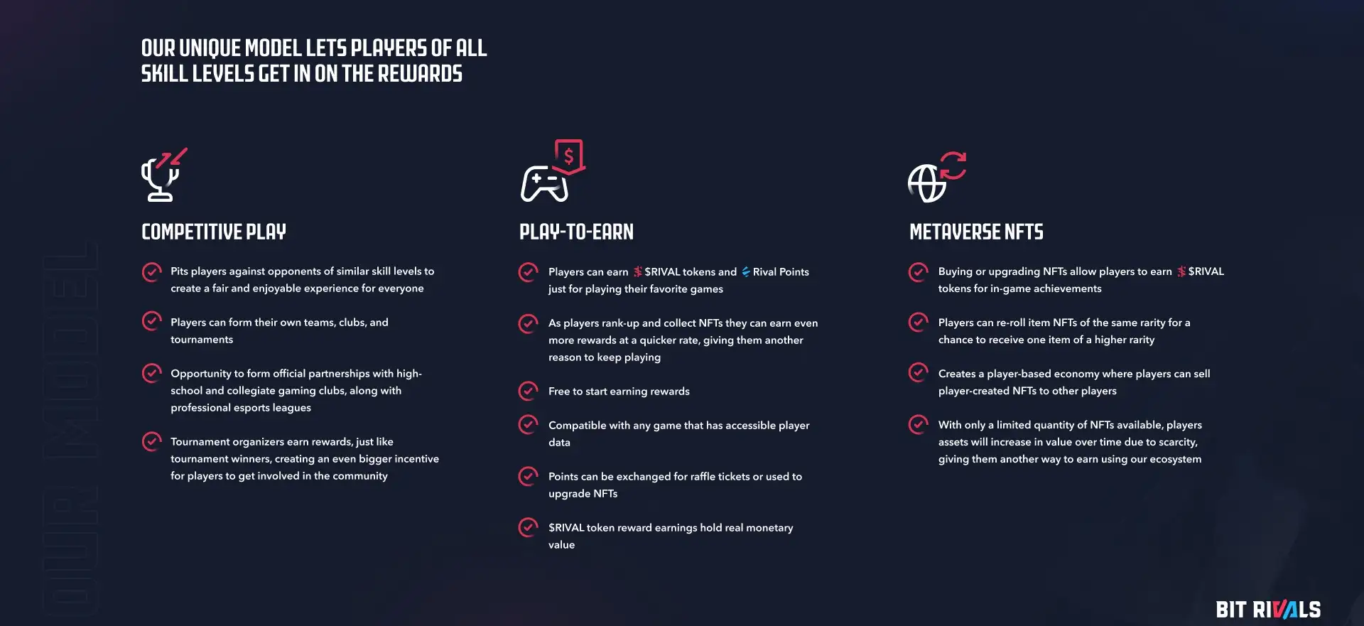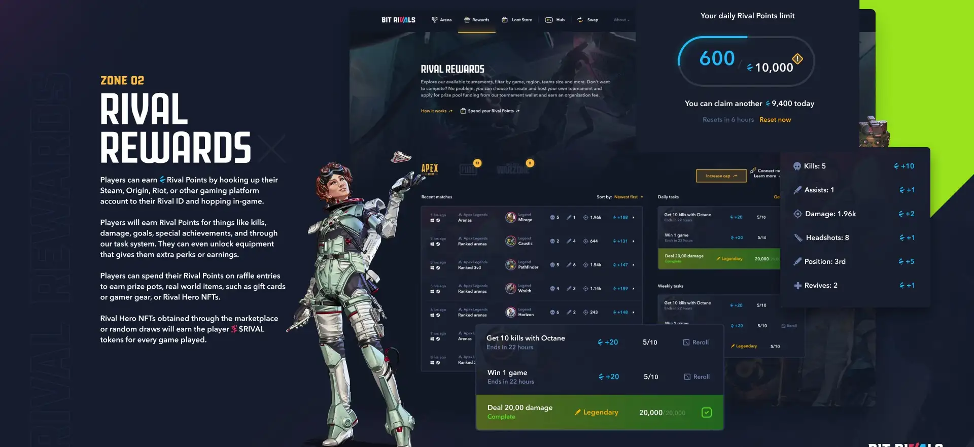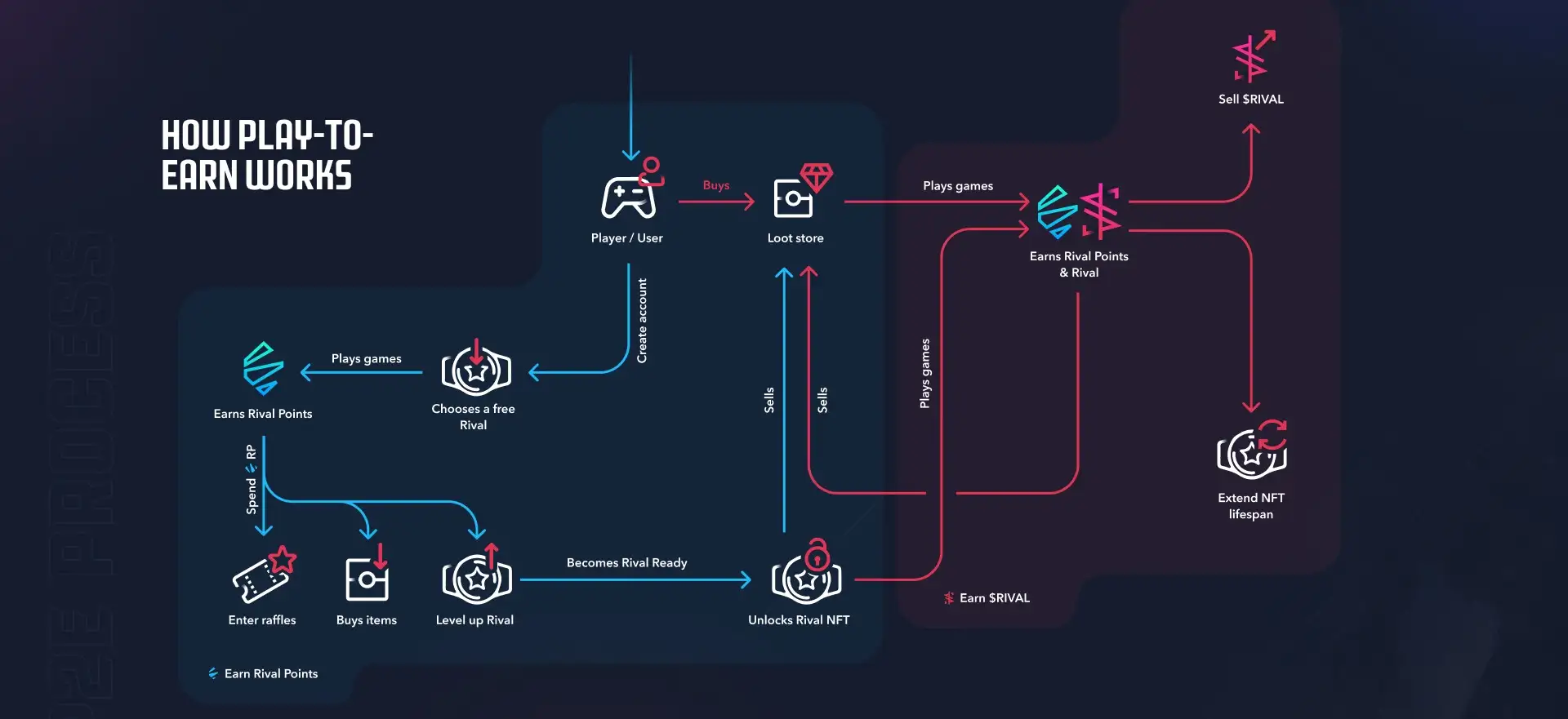 - Rival Rewards: A system that allows players to earn points through gameplay, which can be redeemed for $RIVAL tokens, profile cosmetics, official merchandise, and more. This rewards system is designed to incentivize active participation and engagement within the platform.