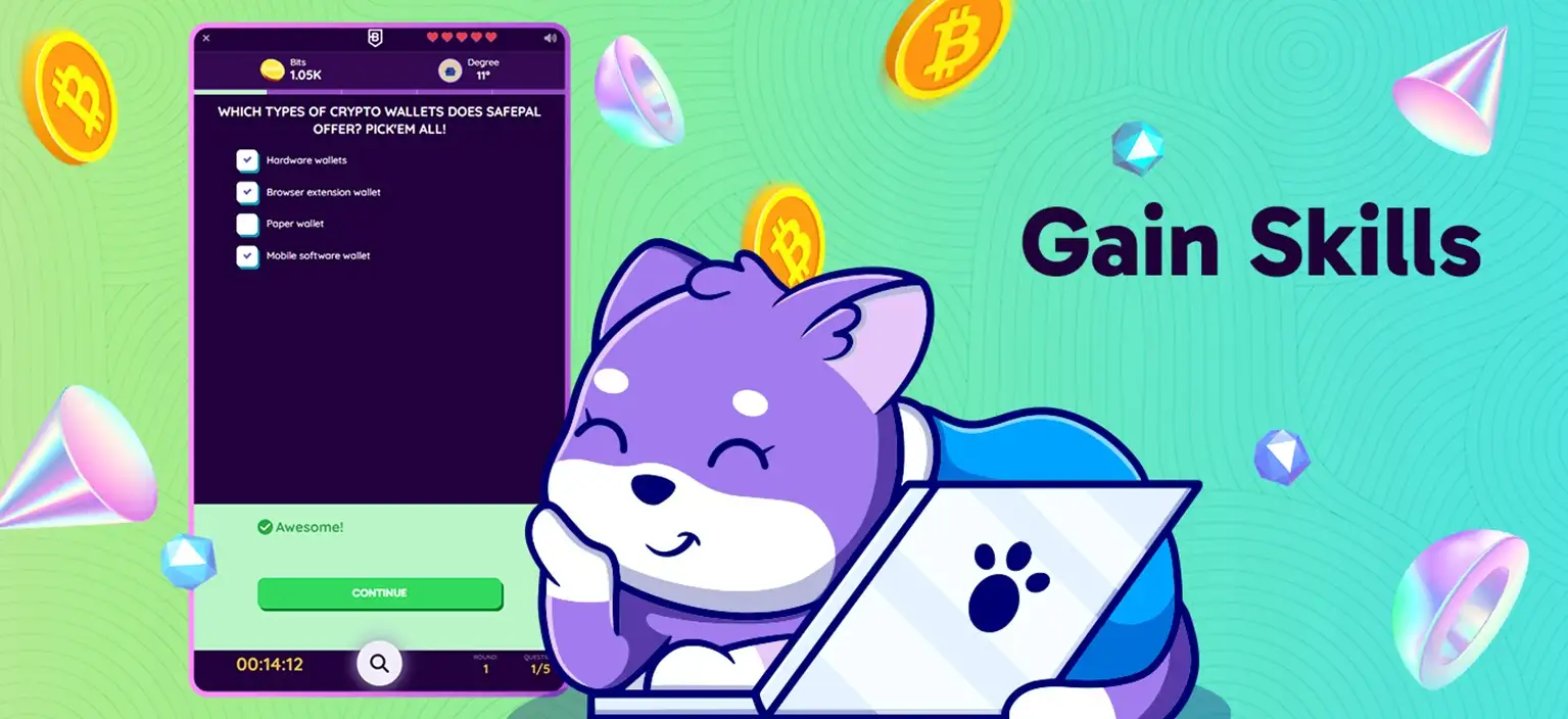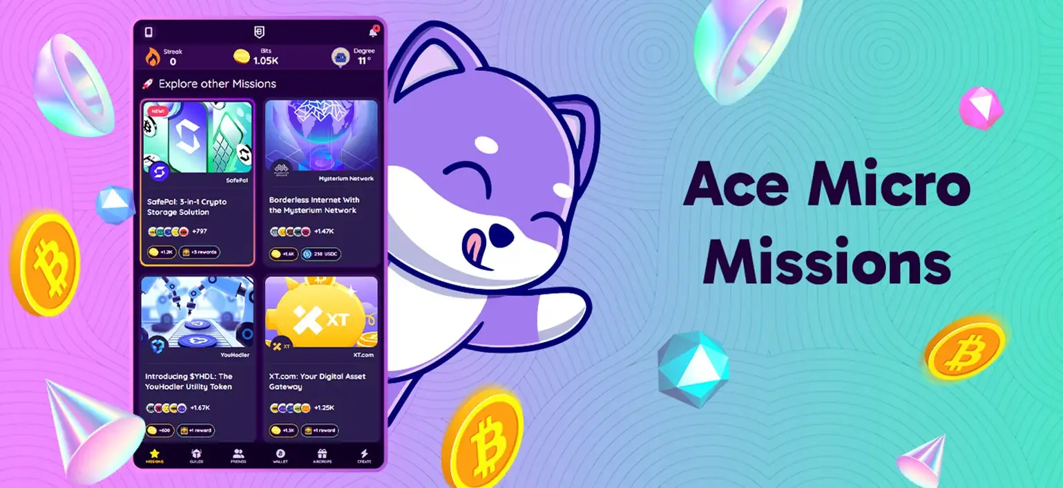 The platform operates through an interactive "play-and-earn" model where users complete missions—mini-tasks such as answering quizzes, signing up for services, or interacting with blockchain technology. As users complete these tasks, they earn Bits, which increase their Degree level and enhance their chances of winning crypto rewards, NFTs, and stablecoins.
