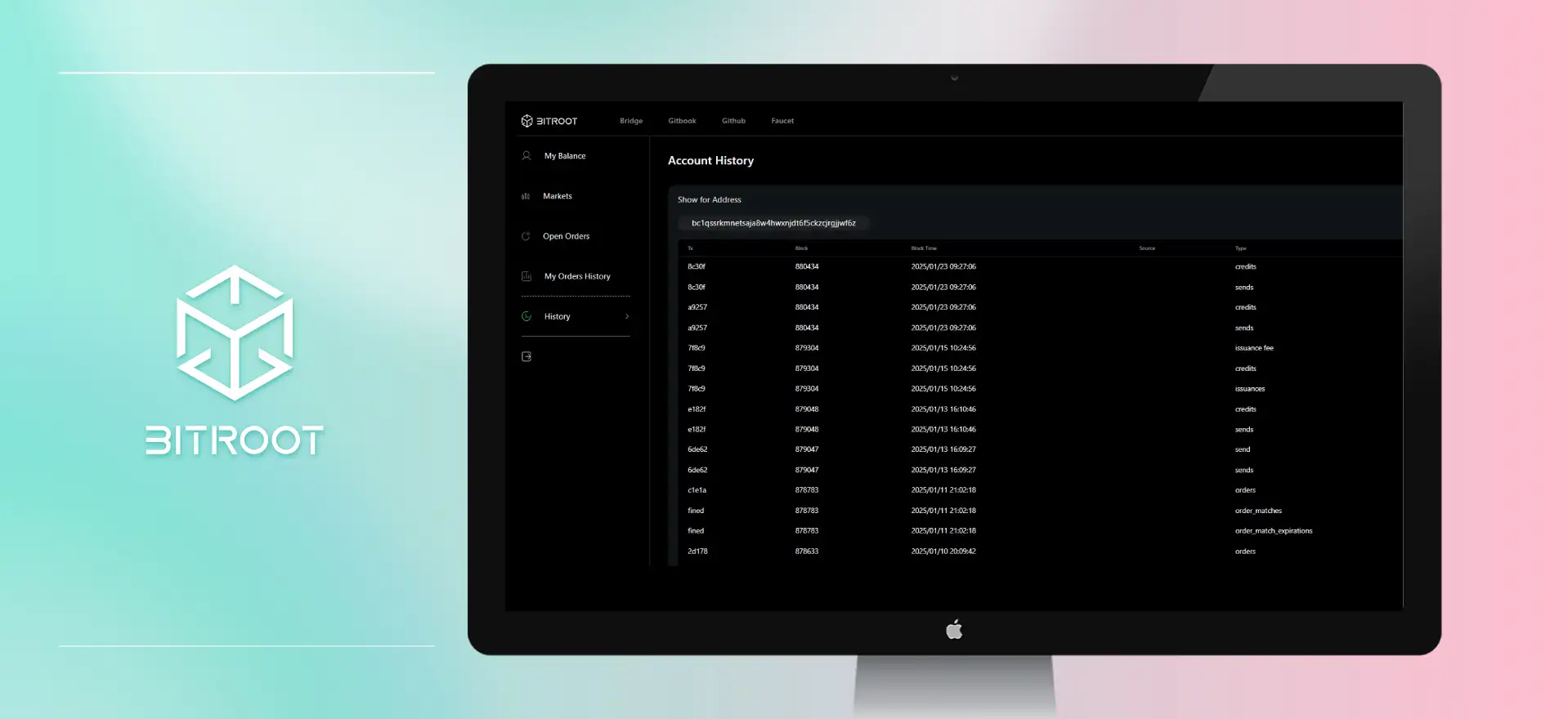 - Decentralized Exchange: Trade Bitroot-based tokens directly on the built-in Bitcoin-native DEX with an order book model.