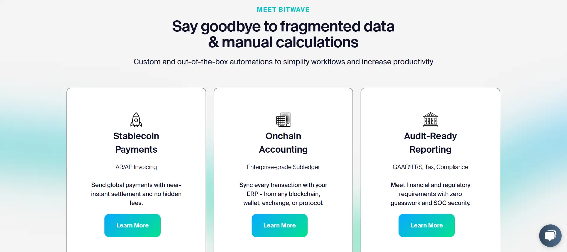 With a mission to enable seamless financial operations in a digital asset-driven future, Bitwave delivers a unified stack of tools that connect to ERPs like NetSuite, Xero, QuickBooks, and Sage Intacct. It supports integrations with exchanges, wallets, and blockchains and meets stringent compliance requirements, including SOC 1 Type 2 and SOC 2 Type 2 certifications. Enterprises turn to Bitwave to reduce manual reconciliation, automate complex workflows, and gain audit-ready transparency across their digital finance stack.