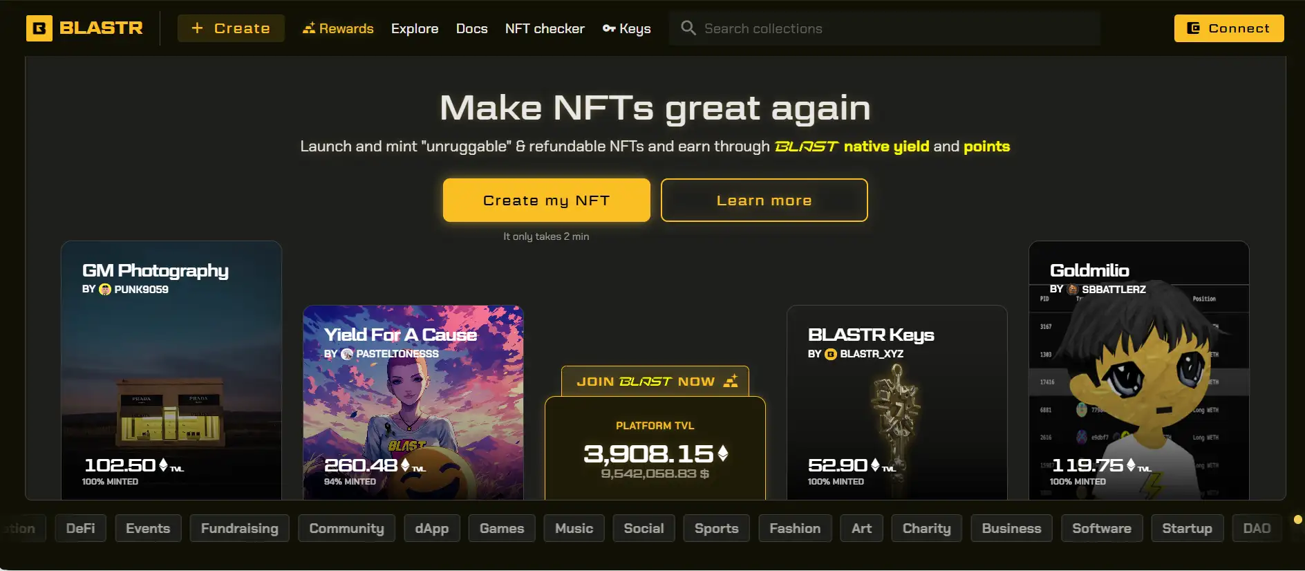 BLASTR is revolutionizing the NFT ecosystem by introducing a unique concept of refundable and "unruggable" NFTs. Unlike traditional NFTs, which often lack intrinsic backing, every NFT on BLASTR is secured by locked funds, creating a tangible safety net for users. This innovative model addresses key concerns in the digital asset space, such as market volatility and investment security. By leveraging the Blast Network, an Ethereum layer-2 scaling solution, BLASTR ensures efficient and cost-effective transactions, making the platform accessible to a broader audience. With a commitment to transparency, security, and empowerment, BLASTR stands out as a pioneer in the growing NFT market.