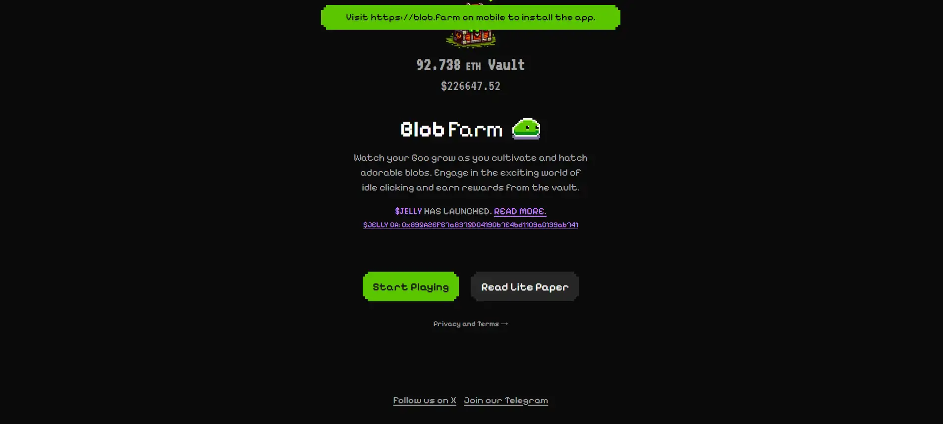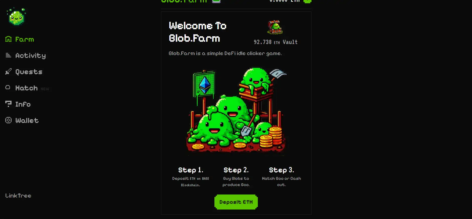 Blob Farm stands as a pioneering blockchain game that redefines gaming by integrating DeFi mechanics with fun and strategic gameplay. Launched on the Base blockchain, Blob Farm offers a dynamic ecosystem where players can purchase blobs using ETH, and these blobs produce goo at a steady rate. Goo can either be used to hatch more blobs, expanding the player’s farm, or sold back into the ecosystem for ETH. This dual-purpose resource introduces strategic decision-making into the gameplay, adding depth and complexity to an otherwise simple gaming mechanic.