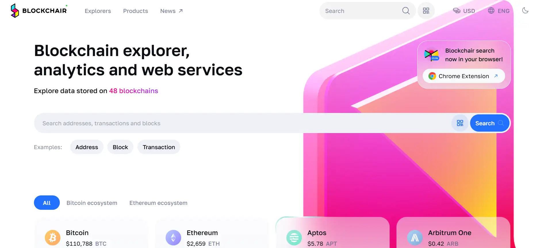 Unlike single-chain explorers like Etherscan, Blockchair offers a multi-chain, privacy-oriented platform for exploring, comparing, and analyzing blockchain data. It supports advanced features like ENS lookup, transaction receipts, wallet statements, and even an AI assistant — all while respecting user privacy.