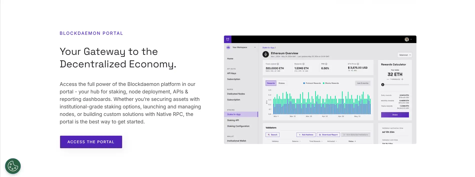 - Access the Portal: The Blockdaemon Portal is your dashboard to control staking, deploy nodes, and manage APIs.