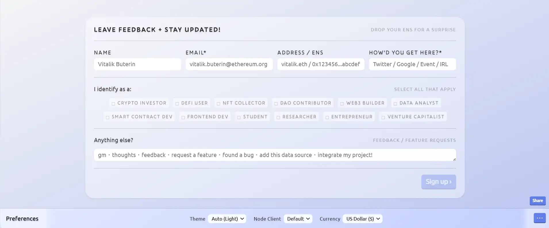 From monitoring token balances and DeFi positions to viewing NFT collections and exploring apps on Ethereum L1, L2, and experimental networks, Blockhead provides an all-in-one portal for exploring the metaverse. It’s built on a principle of modularity and decentralization, offering users the power to choose their own data sources, themes, and networks—giving you full transparency and autonomy over your Web3 journey.