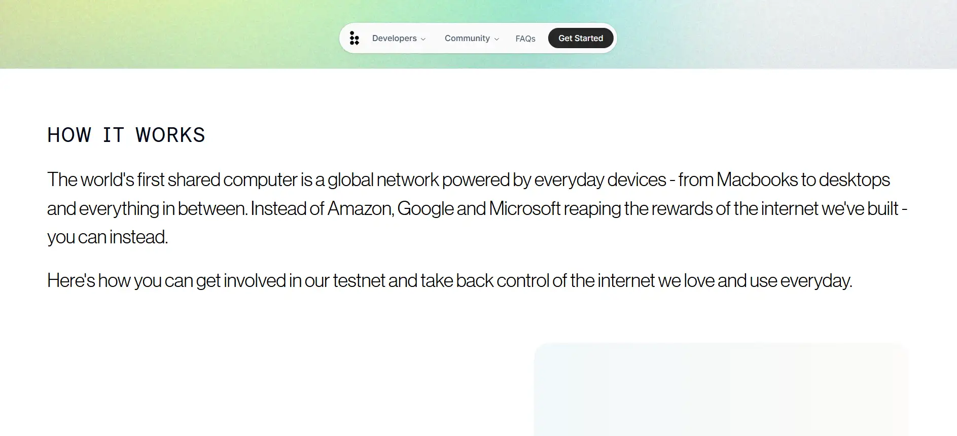 - Shared Global Compute Network: Join the world’s first decentralized shared computer powered by idle devices — from personal laptops to desktops — to support Web3 services and decentralized applications.