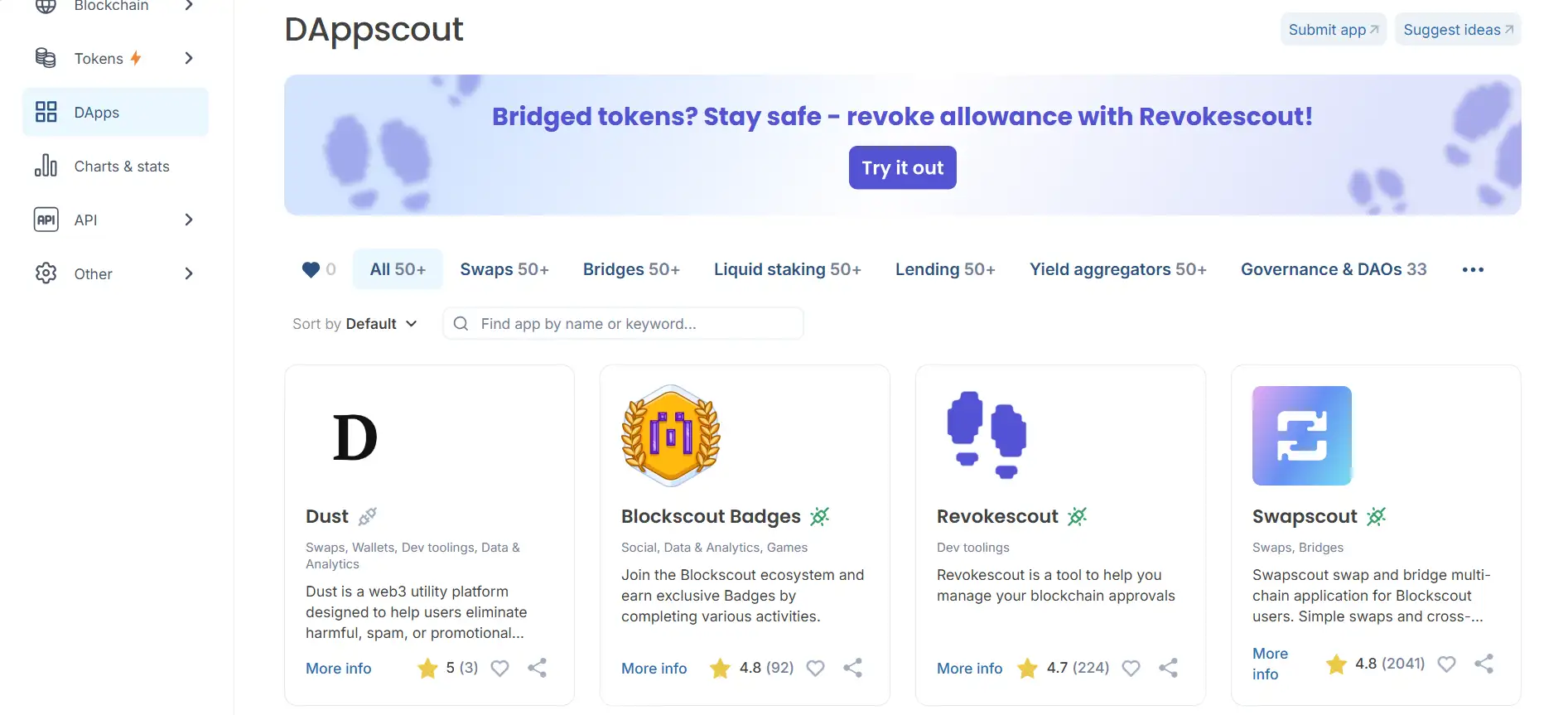 One of Blockscout’s strongest advantages is its integration with decentralized applications (DApps). The DAppscout portal enables users to explore trending tools such as Dust, Revokescout, and Swapscout. This feature encourages engagement with the broader ecosystem while fostering education and awareness.