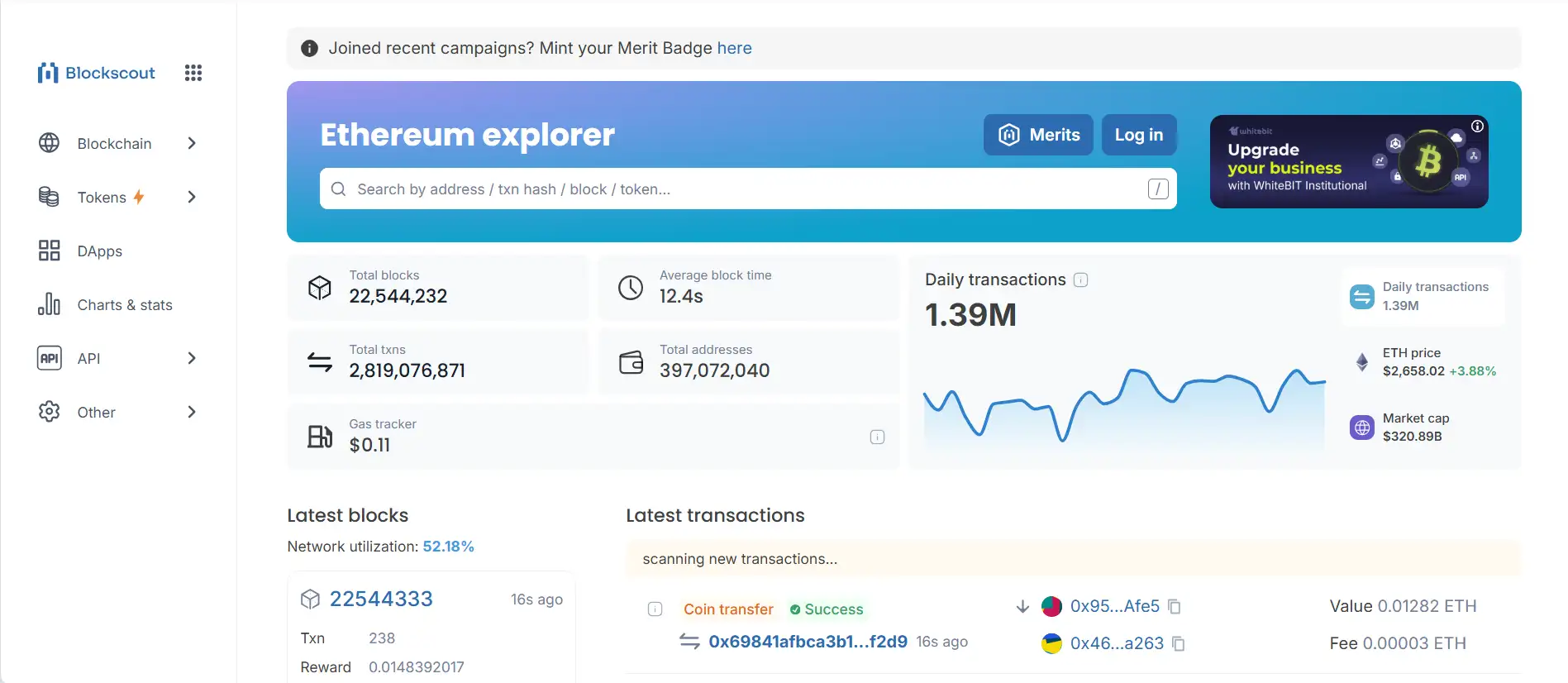 Blockscout is a robust, open-source blockchain explorer that supports Ethereum and other EVM-compatible networks by providing detailed insights into network activity, transactions, blocks, smart contracts, and tokens. Originally created to fill the transparency gap in decentralized ecosystems, Blockscout allows any project to deploy its own fully customizable explorer, making it a highly favored tool among blockchain developers and communities worldwide.