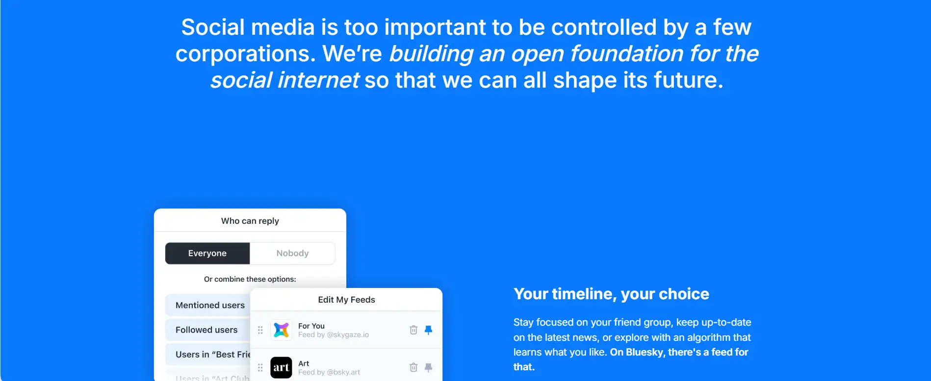 What sets Bluesky apart is its commitment to building the social internet in the spirit of the early web—open, interoperable, and owned by its community. Whether you're looking to engage in global discussions, create your own custom algorithmic feeds, or build third-party clients and moderation tools, Bluesky empowers you with the freedom to shape your own digital world.