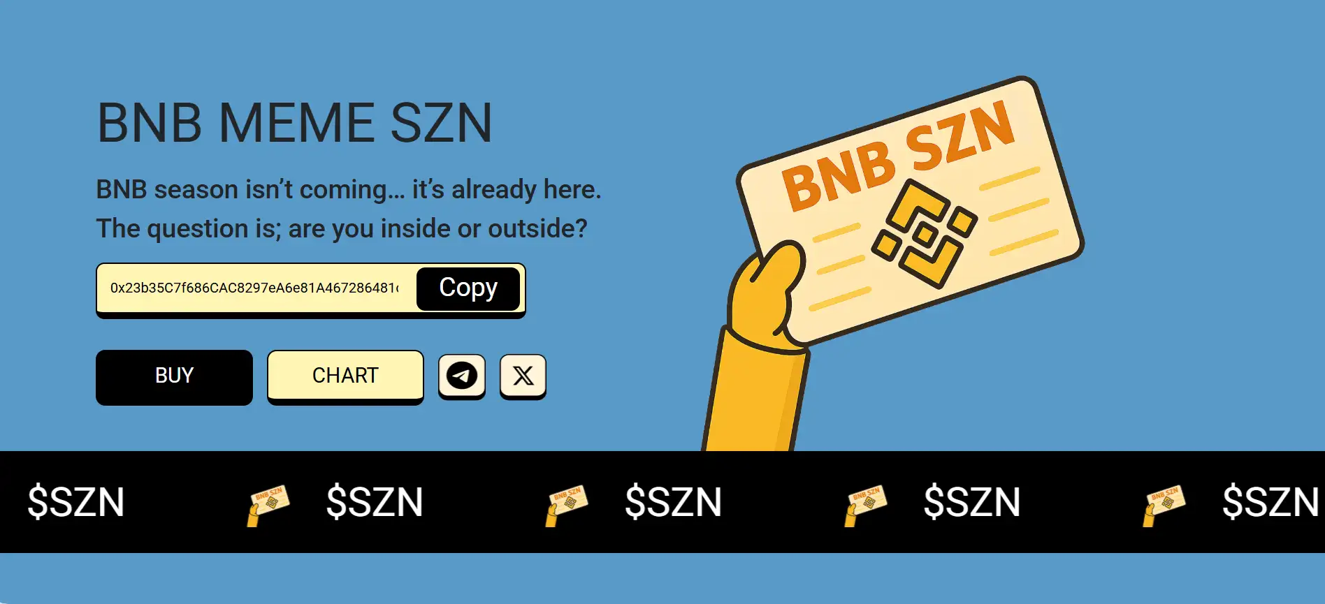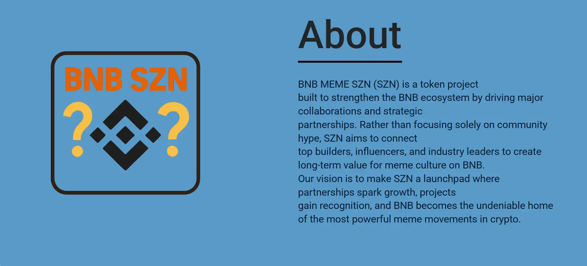 BNB MEME SZN (ticker: $SZN) is an emerging memecoin ecosystem focused on elevating the role of memes, partnerships, and community-driven launches on the BNB Smart Chain. The project's mantra is clear: BNB season isn’t coming—it’s already here. This signals that SZN is not just about anticipation but immediate action and impact. By aligning itself with major BNB ecosystem actors, SZN positions itself as the meme-layer infrastructure BNB didn’t know it needed.