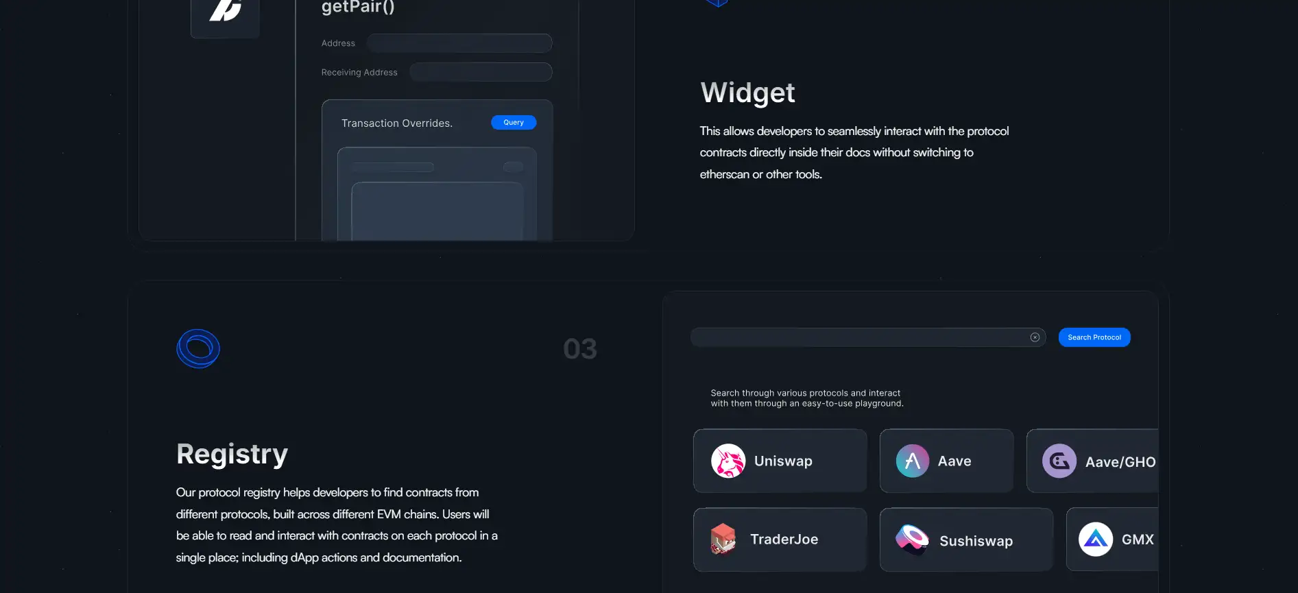 - Protocol Registry: Explore and interact with verified smart contracts across EVM chains in one searchable interface.
