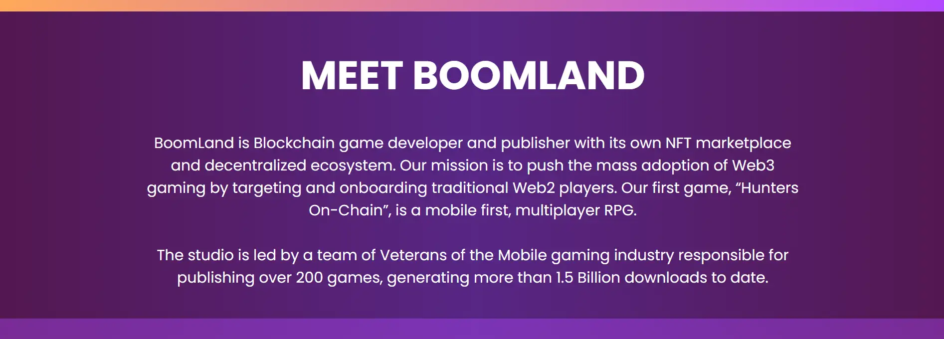 As a publisher and developer, BoomLand focuses on creating games that are both engaging and innovative. Its first title, Hunters On-Chain, has set a benchmark in the blockchain gaming space. Built on the scalable and efficient Polygon blockchain, this mobile-first RPG game integrates NFTs to enhance the gaming experience. Players can collect, upgrade, and trade unique in-game items and characters while enjoying seamless, high-quality gameplay.