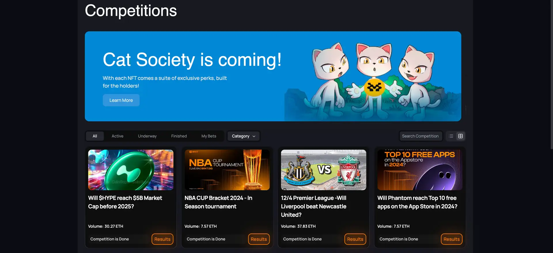 - Browse Competitions: Navigate to the “Competitions” tab to view active, upcoming, or finished brackets. Filter by topic or chain.