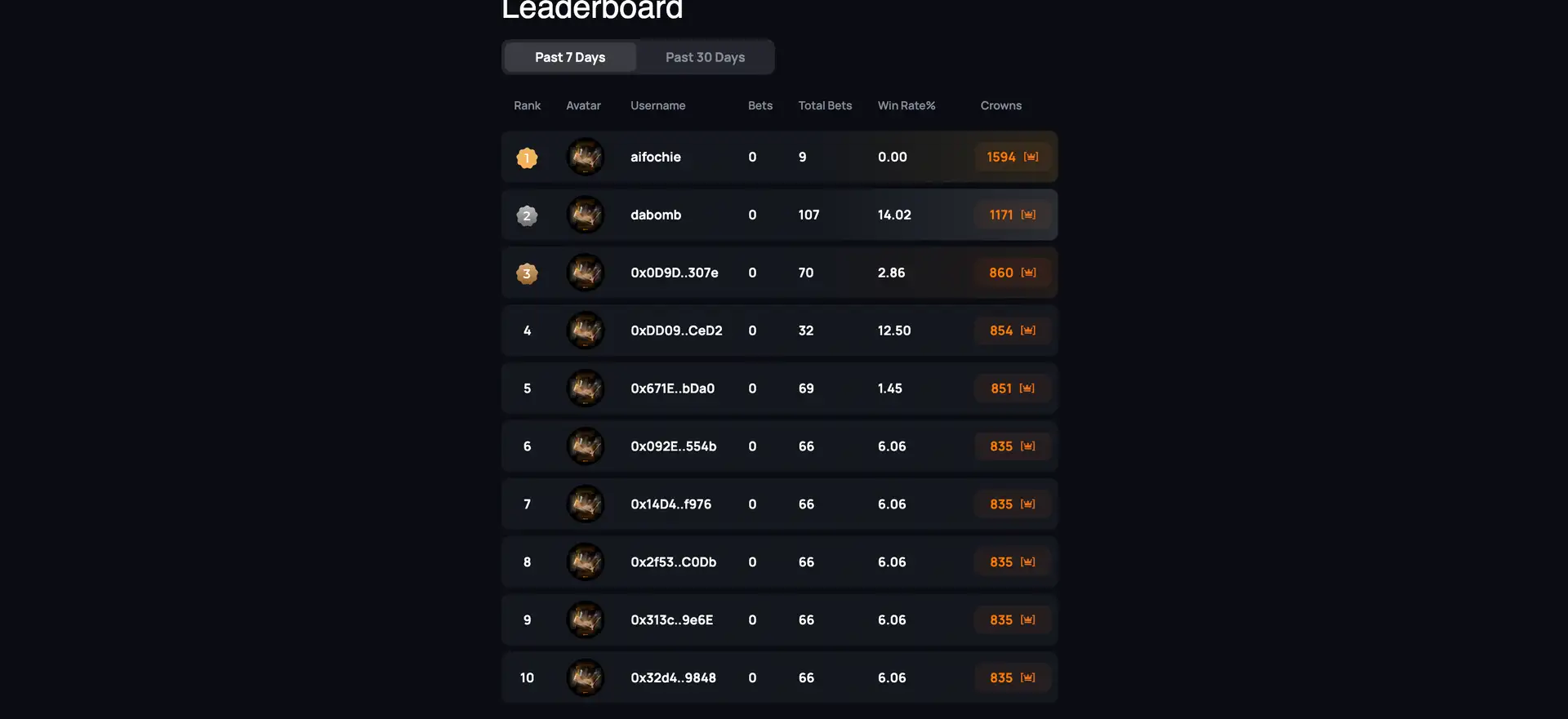 - Track Your Stats: Use the “Leaderboard” tab to monitor your rank, win rates, and historical bets. Crowns are awarded for top performance.